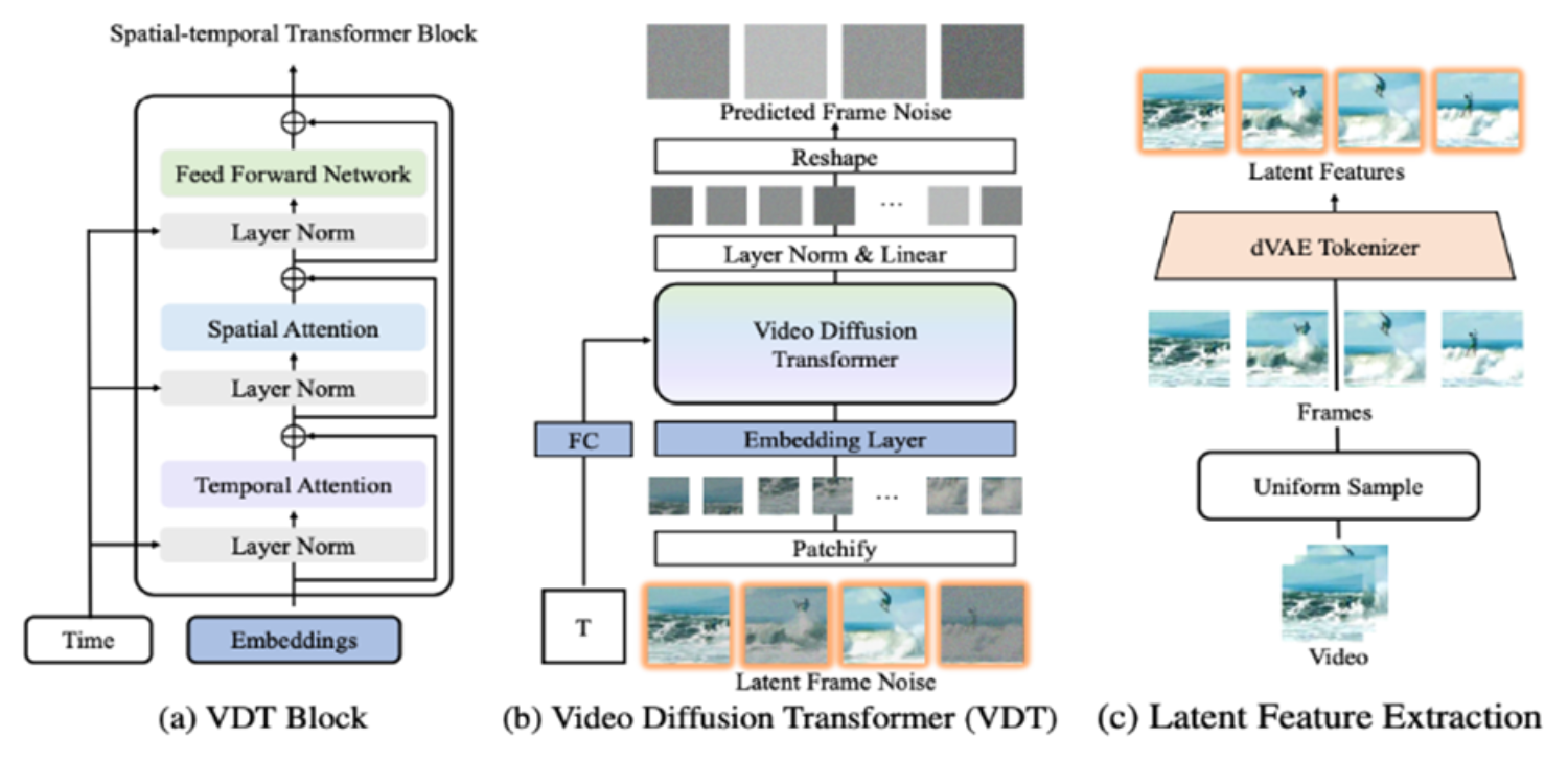 The VDT framework bears striking resemblances to that of Sora, encompassing the following components: