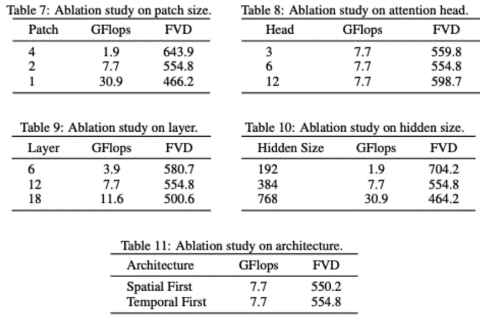 Researchers also conducted some ablation studies on the VDT model’s structure. The results indicate that reducing the patch size, increasing the number of layers, and increasing the Hidden Size can further improve the model’s performance. The position of temporal and spatial attention and the number of attention heads have minimal impact on the model’s results. With the same GFlops, some design trade-offs are needed, and overall, there is no significant difference in the model’s performance. However, increasing GFlops leads to better results, demonstrating the scalability of VDT or Transformer architecture.