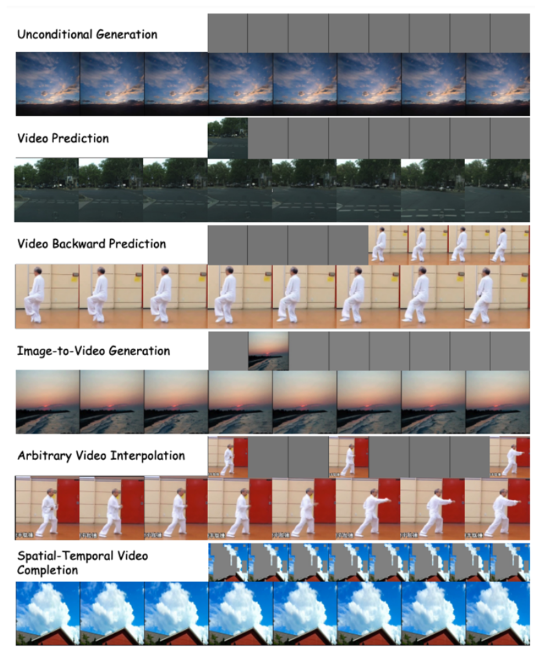 The field of video generation encompasses tasks such as unconditional generation, video prediction, interpolation, and text-to-image generation. Previous research largely focused on individual tasks, often requiring the incorporation of specialized modules for downstream fine-tuning. Additionally, these tasks involve diverse conditioning information, which may vary across different frames and modalities, necessitating a powerful architecture capable of handling varying input lengths and modalities. The introduction of transformers enables the unification of these tasks.
