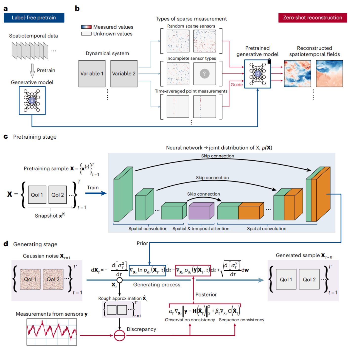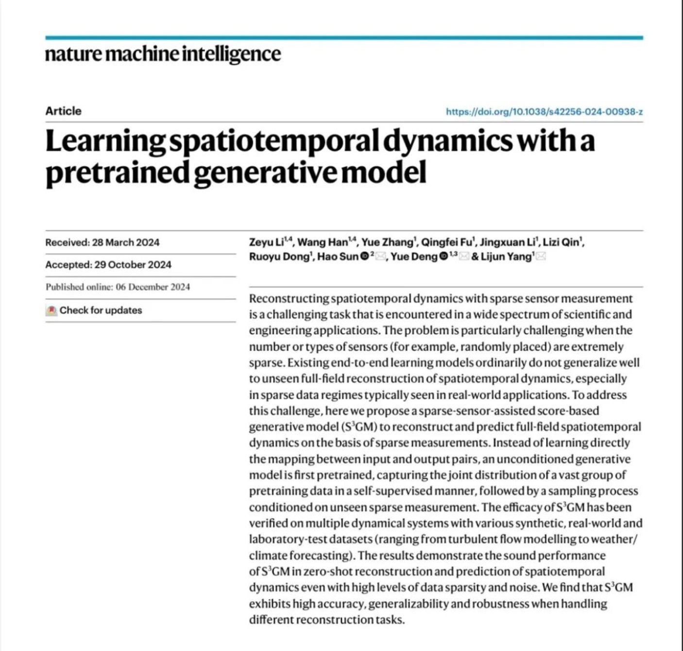 The team of Associate Professor Sun Hao from the Gaoling School of Artificial Intelligence at Renmin University of China, in collaboration with Professor Yang Lijun's team from Beihang University, published an article titled "Learning spatiotemporal dynamics with a pretrained generative model" in the Nature sub-journalNature Machine Intelligence. The research proposed a sparse-sensor-assisted score-based generative model (S3GM) to reconstruct and predict full-field spatiotemporal dynamics on the basis of sparse measurements. The results demonstrate the sound performance of S3GM in zero-shot reconstruction and prediction of spatiotemporal dynamics even with high levels of data sparsity and noise. It is found that S3GM exhibits high accuracy, generalizability and robustness when handling different reconstruction tasks. The co-first authors of the article are Li Zeyu (Beihang) and Han Wang (Beihang), and the co-corresponding authors are Sun Hao (RUC), Deng Yue (Beihang), and Yang Lijun (Beihang).