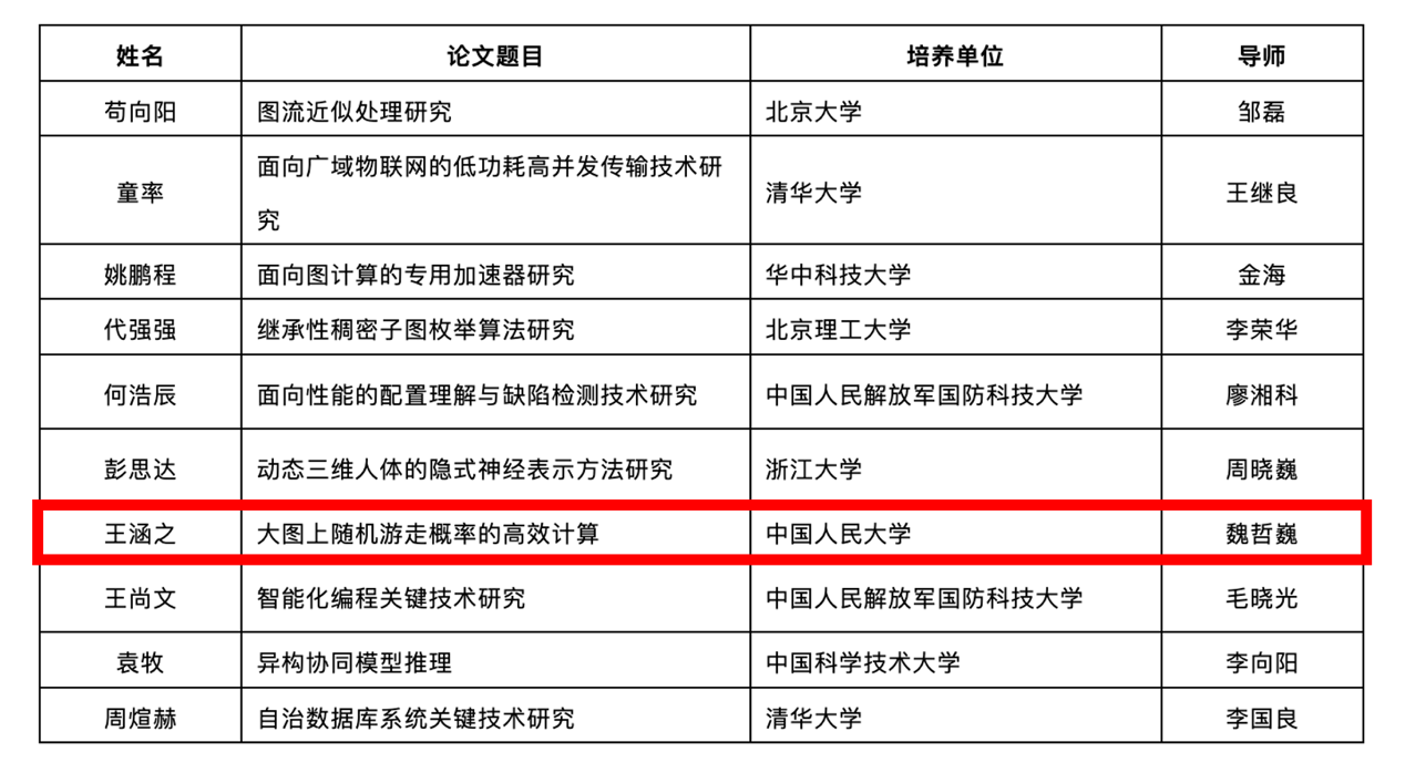 Hanzhi Wang, a PhD student supervised by Professor Zhewei Wei from Gaoling School of Artificial Intelligence at Renmin University of China, was recently awarded the 2024 China Computer Federation (CCF) Outstanding Doctoral Dissertation Award. This award is the most prestigious recognition for computer science PhD students in China and is given to only ten students nationwide each year. The selection is based on the technical depth and significance of each candidate’s doctoral dissertation. Prior to Hanzhi, PhD student Yulei Niu, supervised by Professors Ji-Rong Wen and Zhiwu Lu from Gaoling School of Artificial Intelligence, has won the award in 2021.