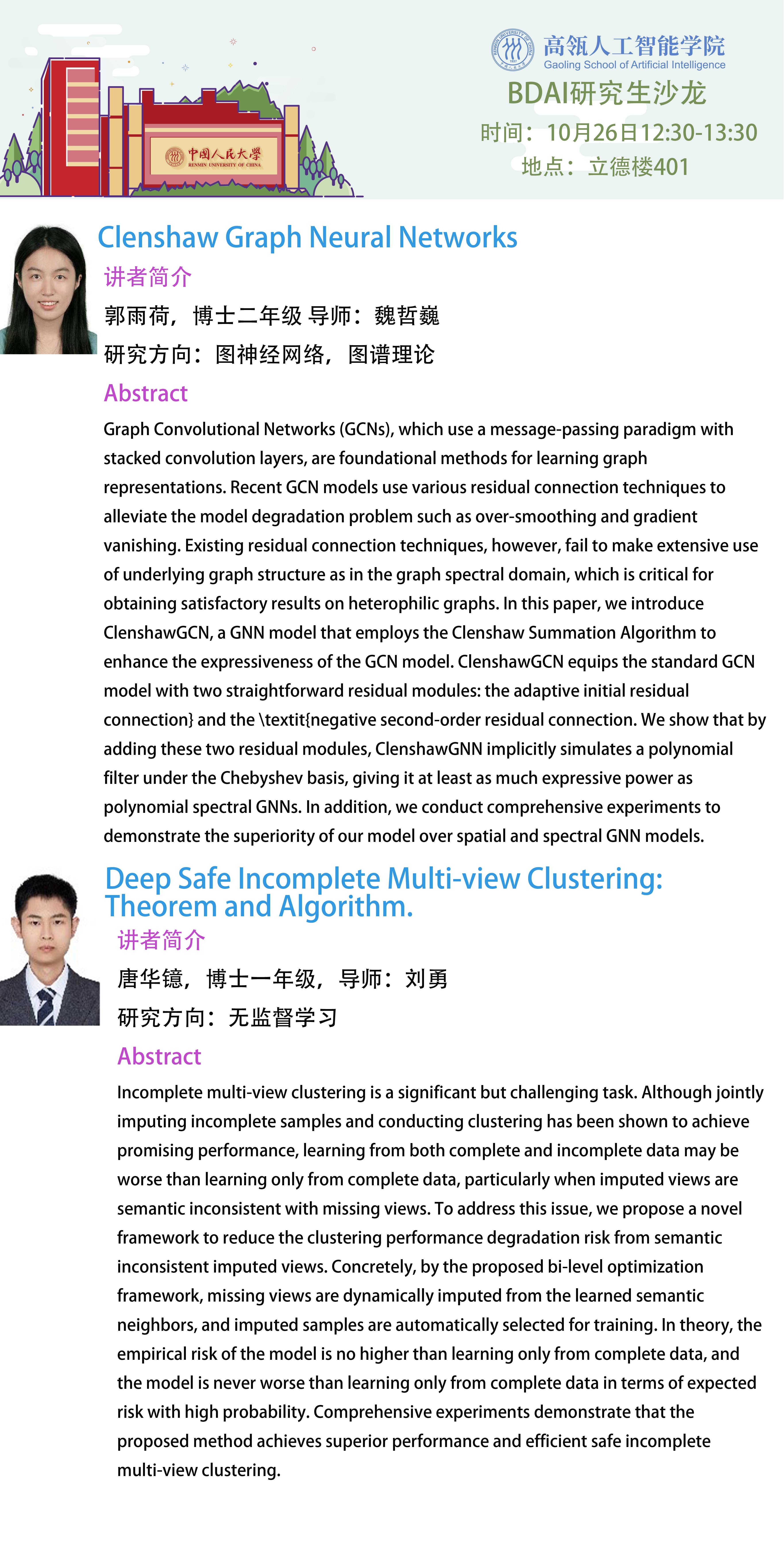 大数据管理与分析方法研究北京市重点实验室(BDAI)研究生沙龙由304永利集团师生组织定期举行。10月26日研讨会由公司魏哲巍教授指导的博士生郭雨荷和刘勇准聘副教授指导的博士生唐华镱分别介绍自己的研究工作。欢迎同学们积极参与研讨!