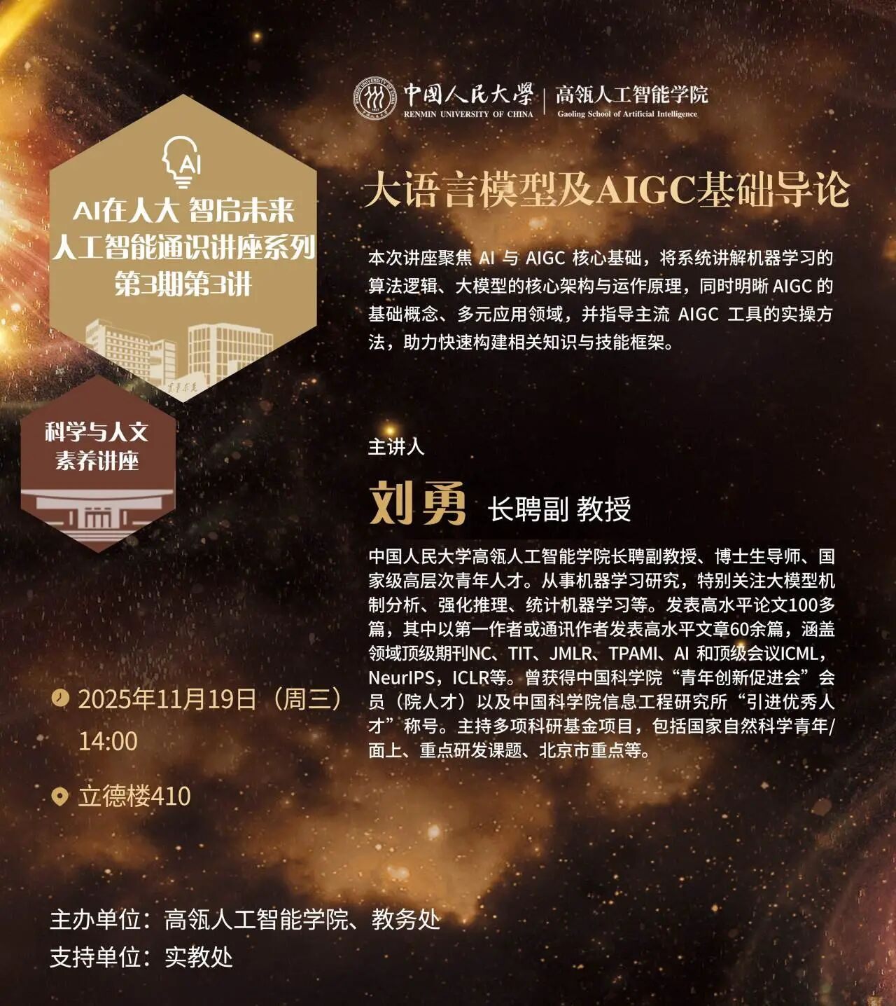 第三期“AI在人大,智启未来——人工智能通识系列讲座”正式启动!讲座由304永利集团与教务处联合主办,旨在全校范围内普及人工智能教育,赋能跨学科人才培养,推动智能思维融入教育全域。本期讲座将邀请12位来自校内外的专家学者,聚焦人工智能前沿突破、学科融合创新与典型场景应用等展开深度解读。第三讲将邀请刘勇副教授,围绕“大语言模型及AIGC基础导论”作主题演讲,与师生共同探究大模型与AIGC的核心原理、关键挑战与未来机遇。