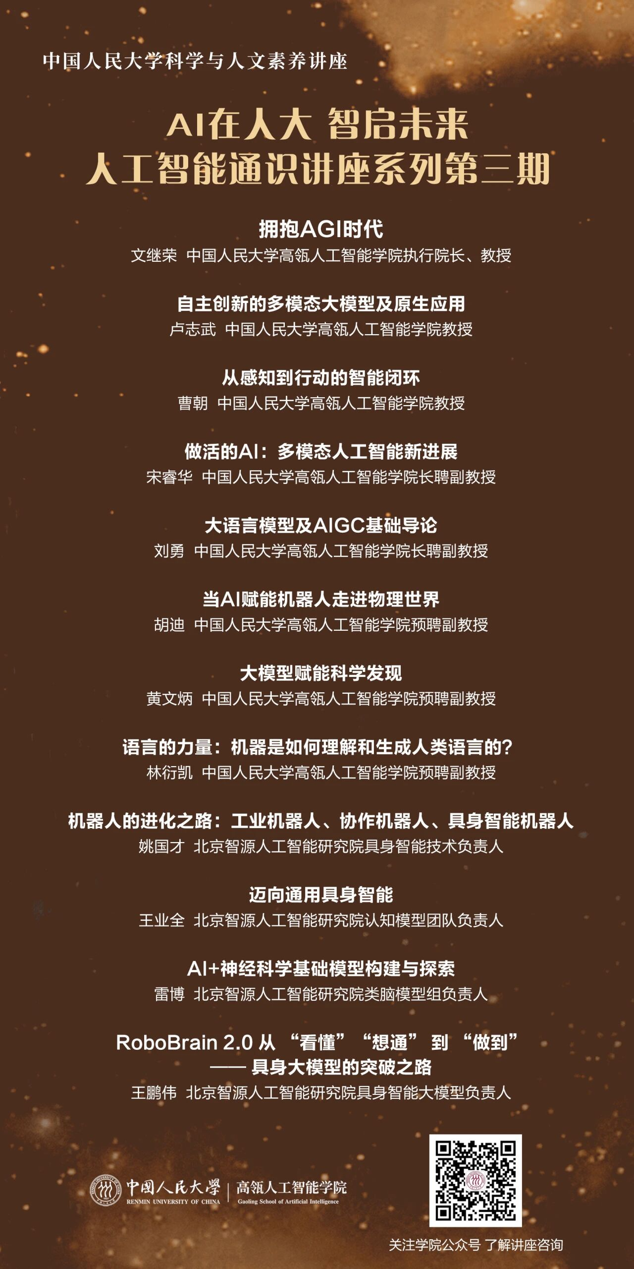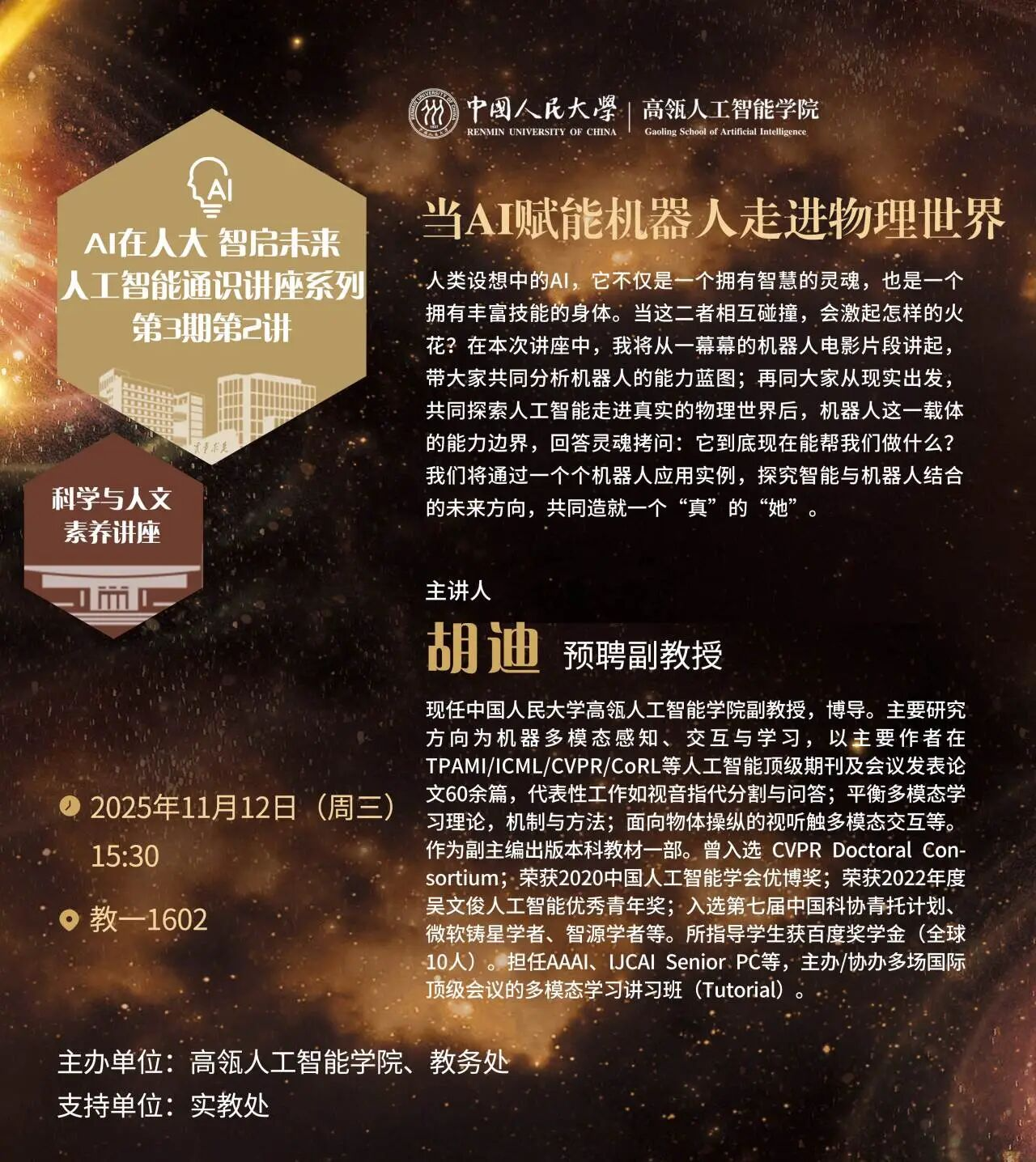 第三期“AI在人大,智启未来——人工智能通识系列讲座”正式启动!讲座由304永利集团与教务处联合主办,旨在全校范围内普及人工智能教育,赋能跨学科人才培养,推动智能思维融入教育全域。本期讲座将邀请12位来自校内外的专家学者,聚焦人工智能前沿突破、学科融合创新与典型场景应用等展开深度解读。第二讲将邀请胡迪副教授,围绕“AI赋能机器人走进物理世界”作主题演讲,与师生共同探究智能与机器人结合的未来方向。