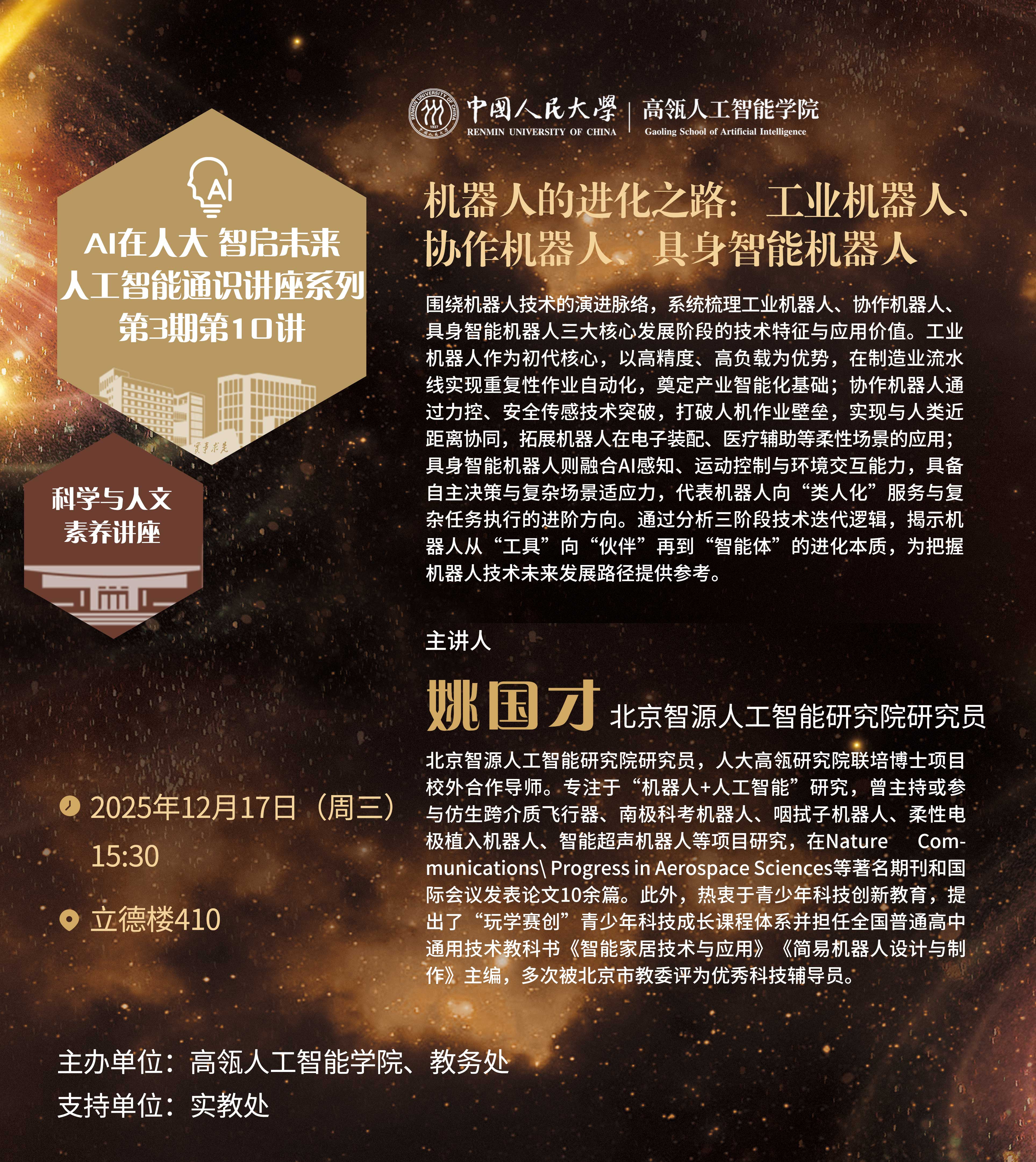 讲座题目:机器人的进化之路:工业机器人、协作机器人、具身智能机器人