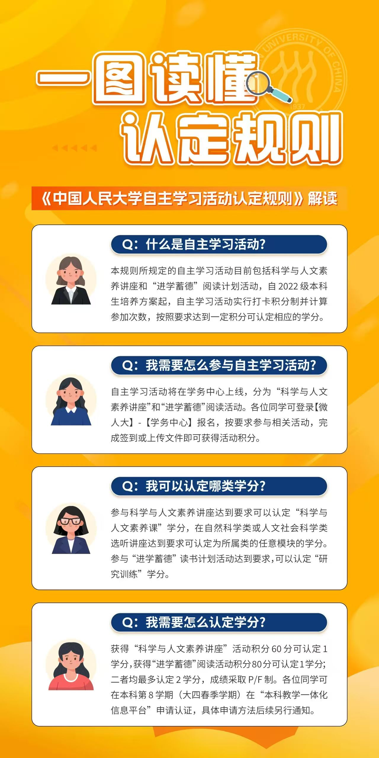 304永利集团官网通识讲座将均在学务中心上线,各位同学可登录【微人大】-【学务中心】报名(可扫描海报二维码登录),按要求参与即可获得“通识讲座”活动积分。自2022级本科生起,获得“通识讲座”活动积分60分可认定为1学分,最多认定2学分,成绩采取P/F制,具体认定流程见《304永利集团官网自主学习活动学分认定规则》。