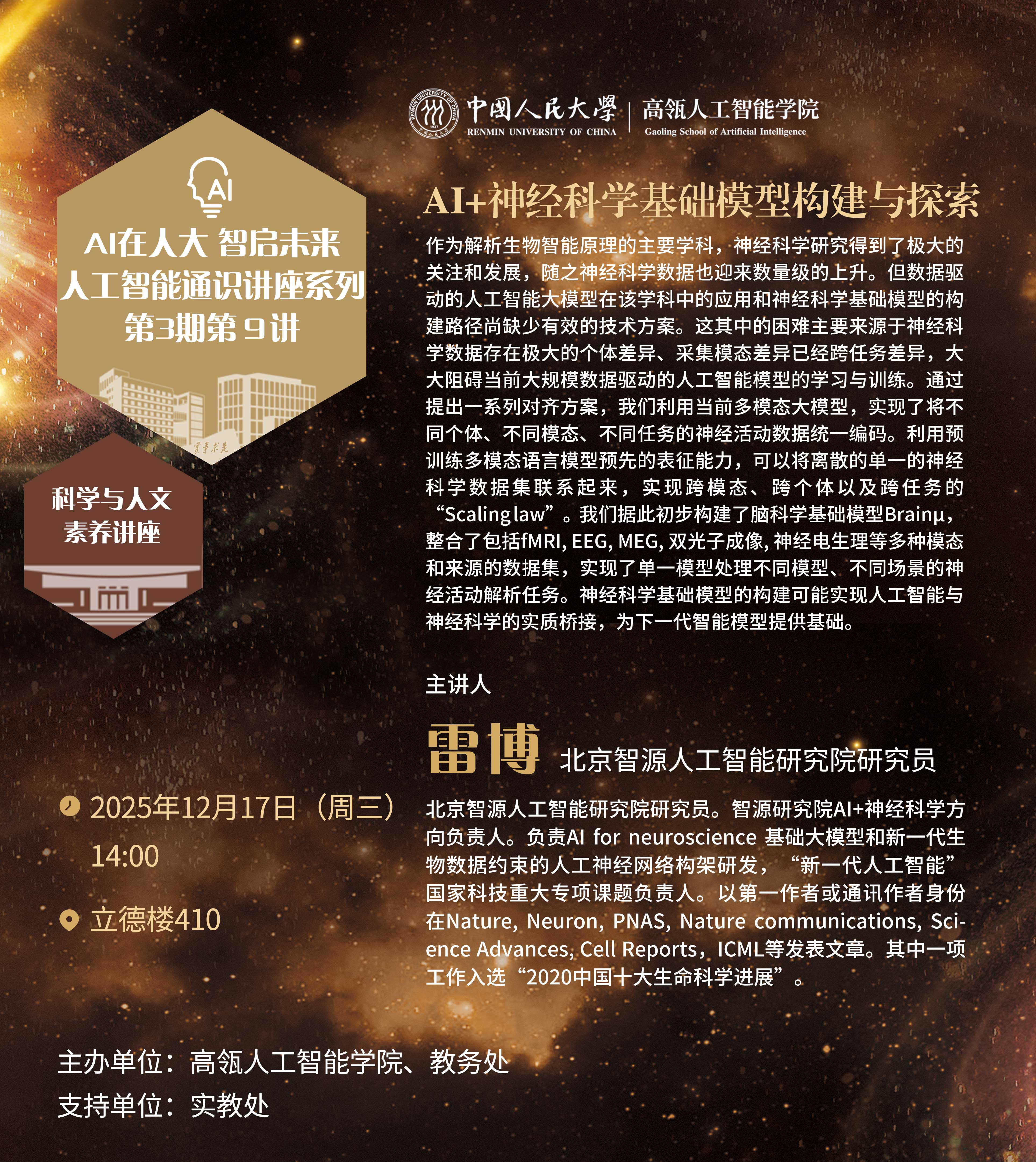 嘉宾简介:雷博,北京智源人工智能研究院研究员。智源研究院AI+神经科学方向负责人。负责AI for neuroscience 基础大模型和新一代生物数据约束的人工神经网络构架研发,“新一代人工智能”国家科技重大专项课题负责人。以第一作者或通讯作者身份在Nature, Neuron, PNAS, Nature communications, Science Advances, Cell Reports,ICML等发表文章。其中一项工作入选“2020中国十大生命科学进展”。