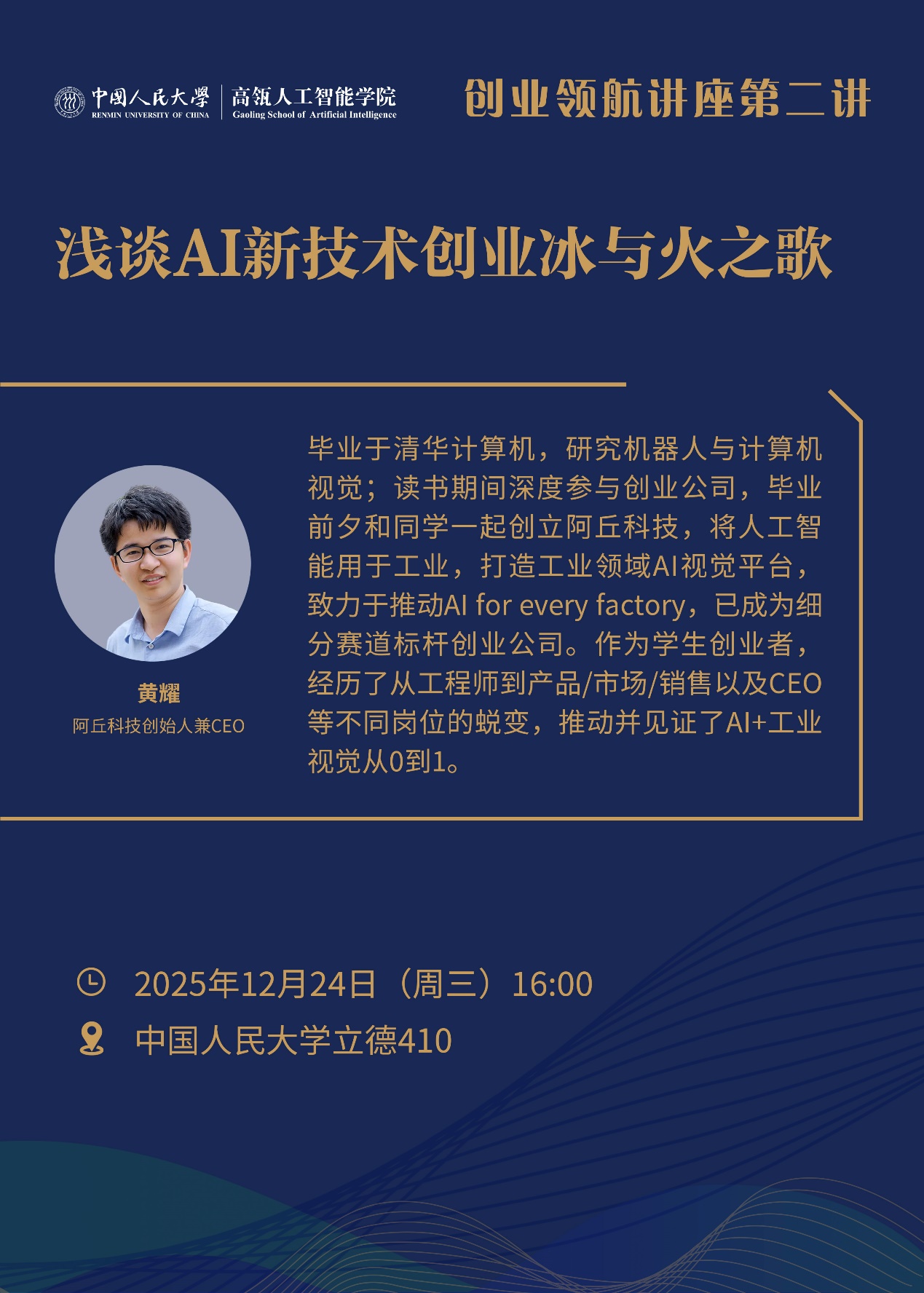 嘉宾简介:黄耀毕业于清华计算机,研究机器人与计算机视觉;读书期间深度参与创业公司,毕业前夕和同学一起创立阿丘科技,将人工智能用于工业,打造工业领域AI视觉平台,致力于推动AI for every factory,已成为细分赛道标杆创业公司。作为员工创业者,经历了从工程师到产品/市场/销售以及CEO等不同岗位的蜕变,推动并见证了AI+工业视觉从0到1。