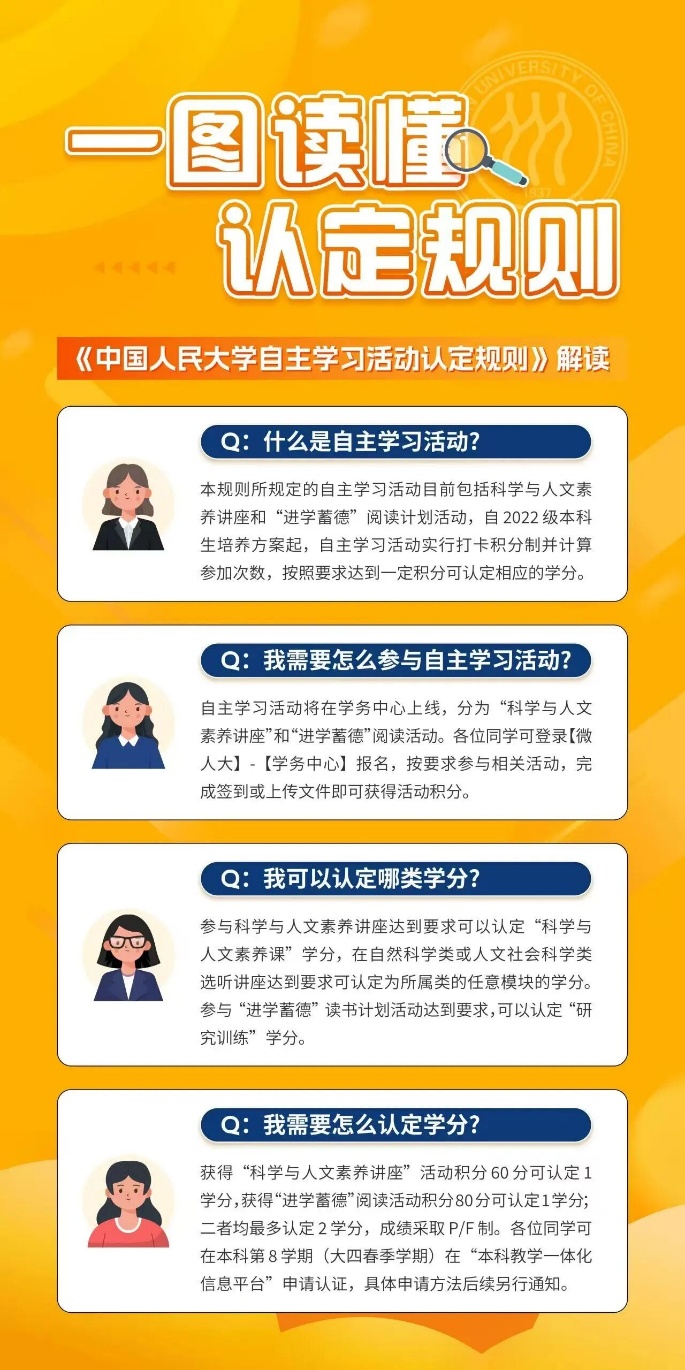 304永利集团官网通识讲座将均在学务中心上线,各位同学可登录【微人大】-【学务中心】报名(可扫描海报二维码登录),按要求参与即可获得“通识讲座”活动积分。自2022级本科生起,获得“通识讲座”活动积分60分可认定为1学分,最多认定2学分,成绩采取P/F制,具体认定流程见《304永利集团官网自主学习活动学分认定规则》。
