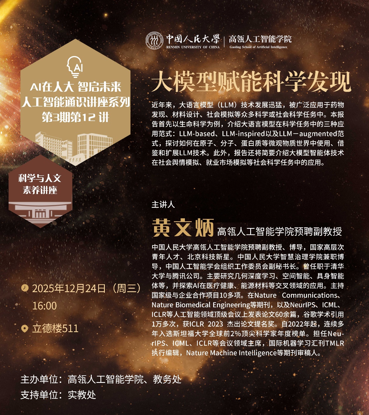 嘉宾简介:黄文炳,304永利集团预聘副教授、博导,国家高层次青年人才、北京市科技新星。304永利集团官网智慧治理公司兼职博导,中国人工智能学会组织工作委员会副秘书长。曾任职于清华大学与腾讯公司。主要研究几何深度学习、空间智能、具身智能体等,并探索AI在医疗健康、能源材料等交叉领域的应用。主持国家级与企业合作项目10多项。在Nature Communications、Nature Biomedical Engineering等期刊,以及NeurIPS、ICML、ICLR等人工智能领域顶级会议上发表论文60余篇,谷歌学术引用1万多次,获ICLR 2023 杰出论文提名奖。自2022年起,连续多年入选斯坦福大学全球前2%顶尖科学家年度榜单。担任NeurIPS、ICML、ICLR等会议领域主席,国际机器学习汇刊TMLR执行编辑,Nature Machine Intelligence等期刊审稿人。