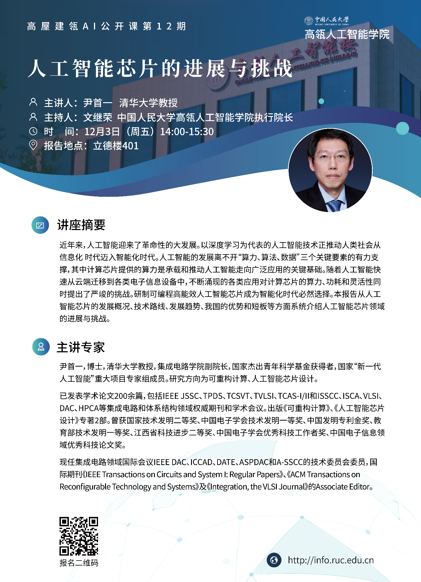 尹首一,博士,清华大学教授,集成电路公司副经理,国家杰出青年科学基金获得者,国家“新一代人工智能”重大项目专家组成员。研究方向为可重构计算、人工智能芯片设计。