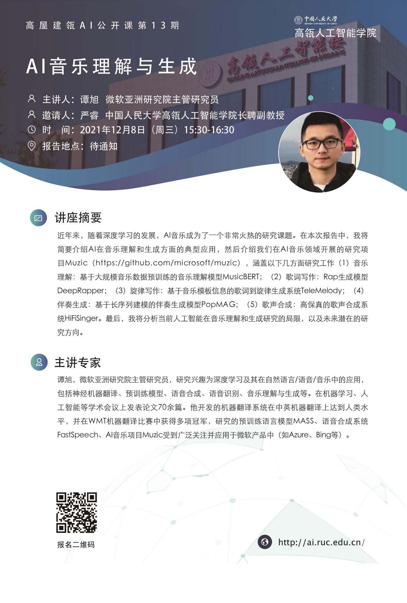近年来,随着深度学习的发展,AI音乐成为了一个非常火热的研究课题。在本次报告中,我将简要介绍AI在音乐理解和生成方面的典型应用,然后介绍我们在AI音乐领域开展的研究项目Muzic(https://github.com/microsoft/muzic),涵盖以下几方面研究工作(1)音乐理解:基于大规模音乐数据预训练的音乐理解模型MusicBERT;(2)歌词写作:Rap生成模型DeepRapper;(3)旋律写作:基于音乐模板信息的歌词到旋律生成系统TeleMelody;(4)伴奏生成:基于长序列建模的伴奏生成模型PopMAG;(5)歌声合成:高保真的歌声合成系统HiFiSinger。最后,我将分析当前人工智能在音乐理解和生成研究的局限,以及未来潜在的研究方向。