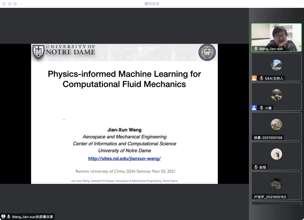 近日,公司举办了“高屋建瓴AI公开课”第9期。学经理聘副教授孙浩邀请到美国圣母大学长聘序列助理教授王建勋,“Physics-informed machine learning for computational fluid mechanics”为题,围绕计算流体力学问题中的挑战及与机器学习的结合进行了精彩分享。出于防疫考虑,活动以线上的方式召开。