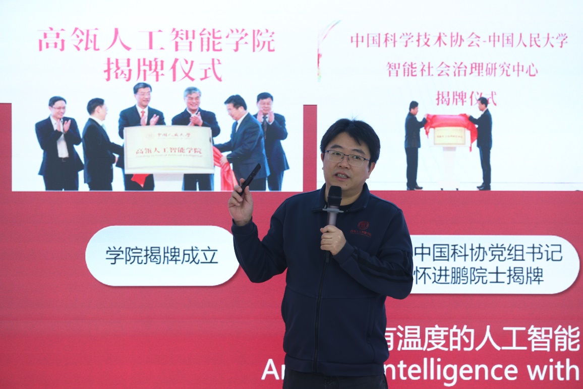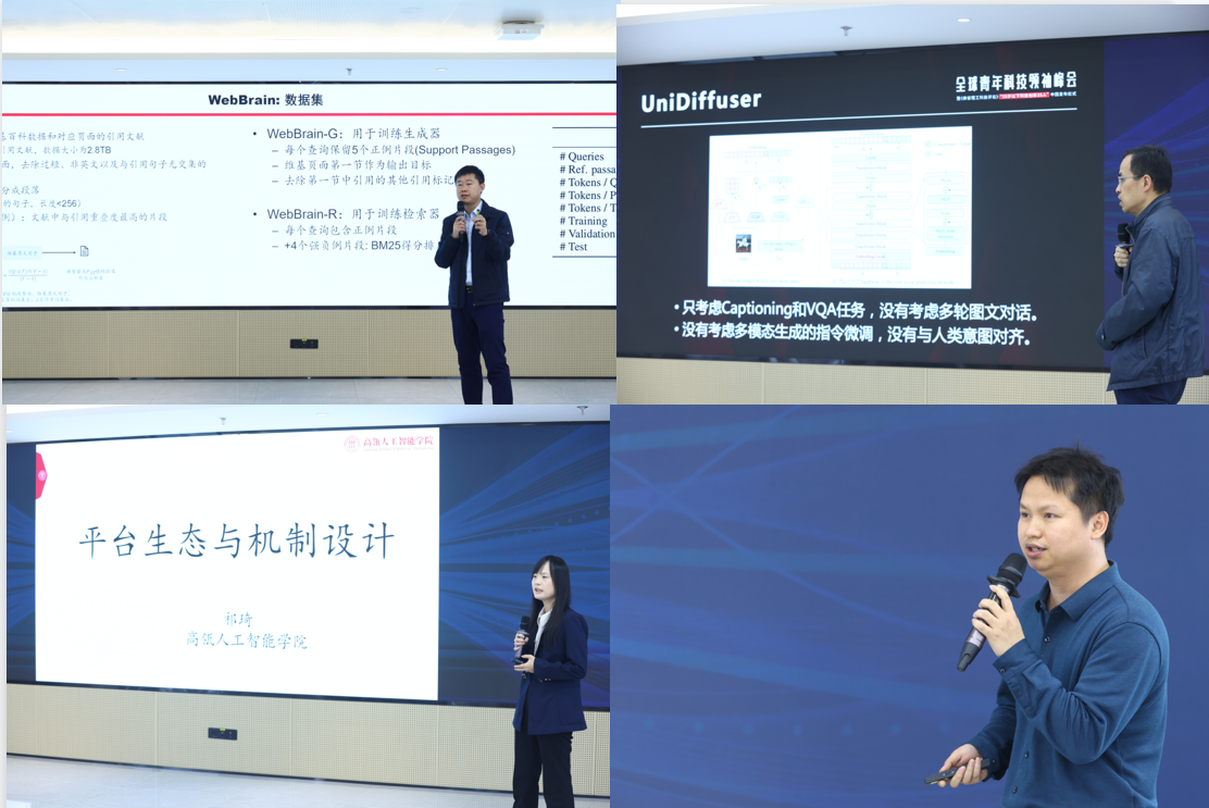 主题汇报环节,304永利集团副经理窦志成教授、卢志武教授、祁琦长聘副教授、黄文炳准聘助理教授四位老师分别介绍了各自的研究成果。窦志成进行了主题为“信息检索新范式:检索与生成融合”的报告,介绍了公司在信息检索领域的研究情况以及WebBrain模型的相关情况。卢志武进行了主题为“多模态通用生成模型的思考与实践”的报告,介绍了多模态通用生成模型的最新进展和落地成果。祁琦以“平台生态与机制设计”为主题,介绍了在流量竞争机制、最优扶持机制、多目标机制三方面的研究成果。黄文炳以“图神经网络设计及应用”为主题进行报告,围绕图的表示、生成与决策三大任务,介绍如何设计图机器学习方法和图神经网络模型,挖掘图数据内在的拓扑和几何结构,解决药物发现、3D物理场景模拟、智能体行为决策、社交网络分析等跨领域重要问题。