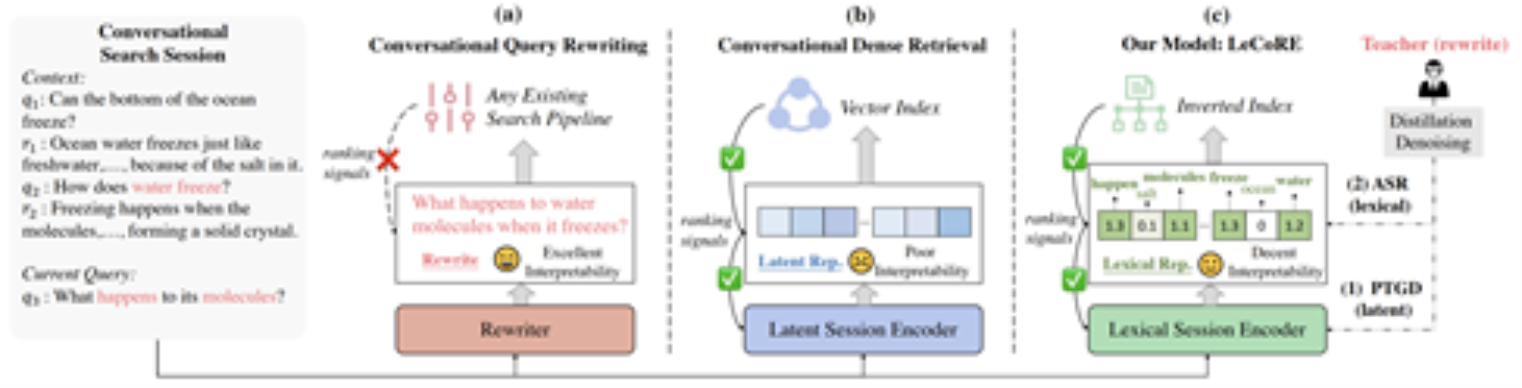 图1 已有的对话式搜索方法与LeCoRE的概念图示。LeCoRE采用了基于知识蒸馏的多级去噪方法,同时支持面向下游搜索任务的端到端优化和较好的可解释性。