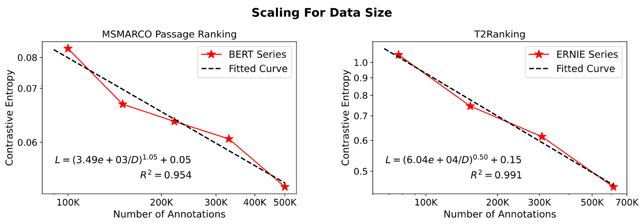 毛佳昕副教授与清华大学艾清遥助理教授、刘奕群教授、研究生方言、詹靖涛、陈佳、苏炜航合作发表的长文“Scaling Laws for Dense Retrieval”旨在研究稠密检索模型的检索性能受到模型大小、数据规模、训练计算量三个关键因素影响的“规模缩放定律”(Scaling Laws)。通过使用“对比熵”(contrastive entropy)这一连续的指标对多个稠密检索模型的检索性能进行评价,论文发现稠密检索模型的性能遵循与模型大小和标注数据规模相关的幂律函数关系。