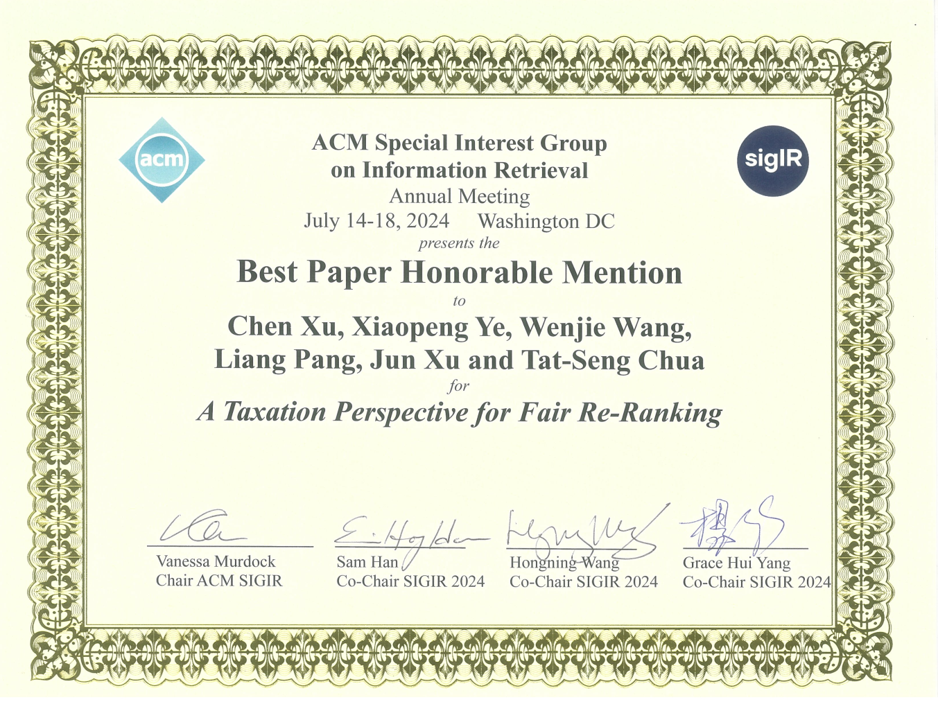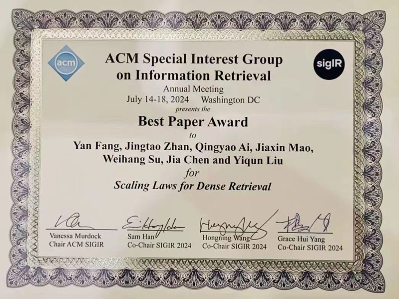 7月17日,信息检索领域国际学术会议SIGIR 2024正式公布了论文获奖名单,304永利集团师生参与的4篇论文获奖。徐君教授团队论文“A Taxation Perspective for Fair Re-ranking”获得了长文最佳论文提名奖(Best Paper Honorable Mention Award), 毛佳昕副教授参与的长文“Scaling Laws for Dense Retrieval”被评为最佳论文奖(Best Paper Award)。徐君教授作为通讯作者的短文“ReCODE: Modeling Repeat Consumption with Neural ODE”,毛佳昕副教授作为通讯作者的演示论文“CoSearchAgent: A Lightweight Collaborative Search Agent with Large Language Models”获得了最佳短文提名(Best Short Paper Nominees)。