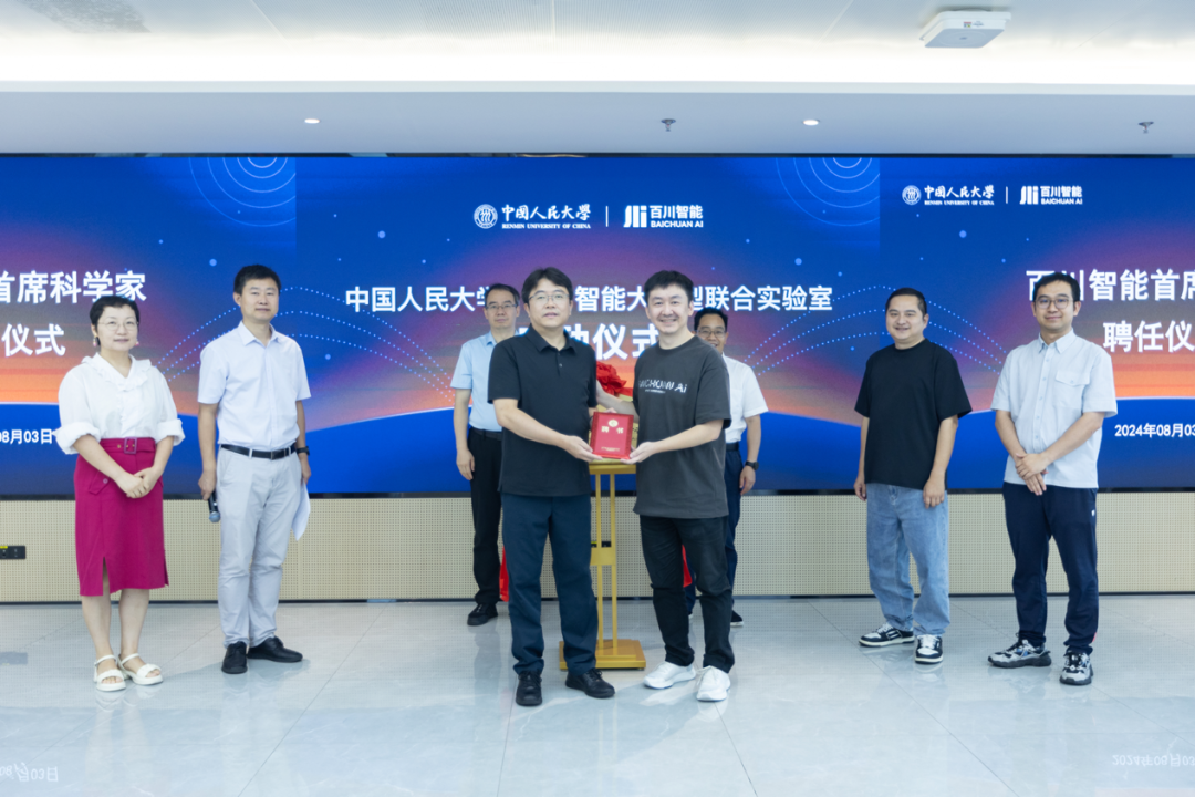 在冯仕政副董事长、杜忠朝副处长,谢剑、陈炜鹏的见证下,文继荣经理与百川智能创始人兼CEO王小川先生为实验室揭牌。同时,百川智能聘请文继荣教授担任百川智能首席科学家。