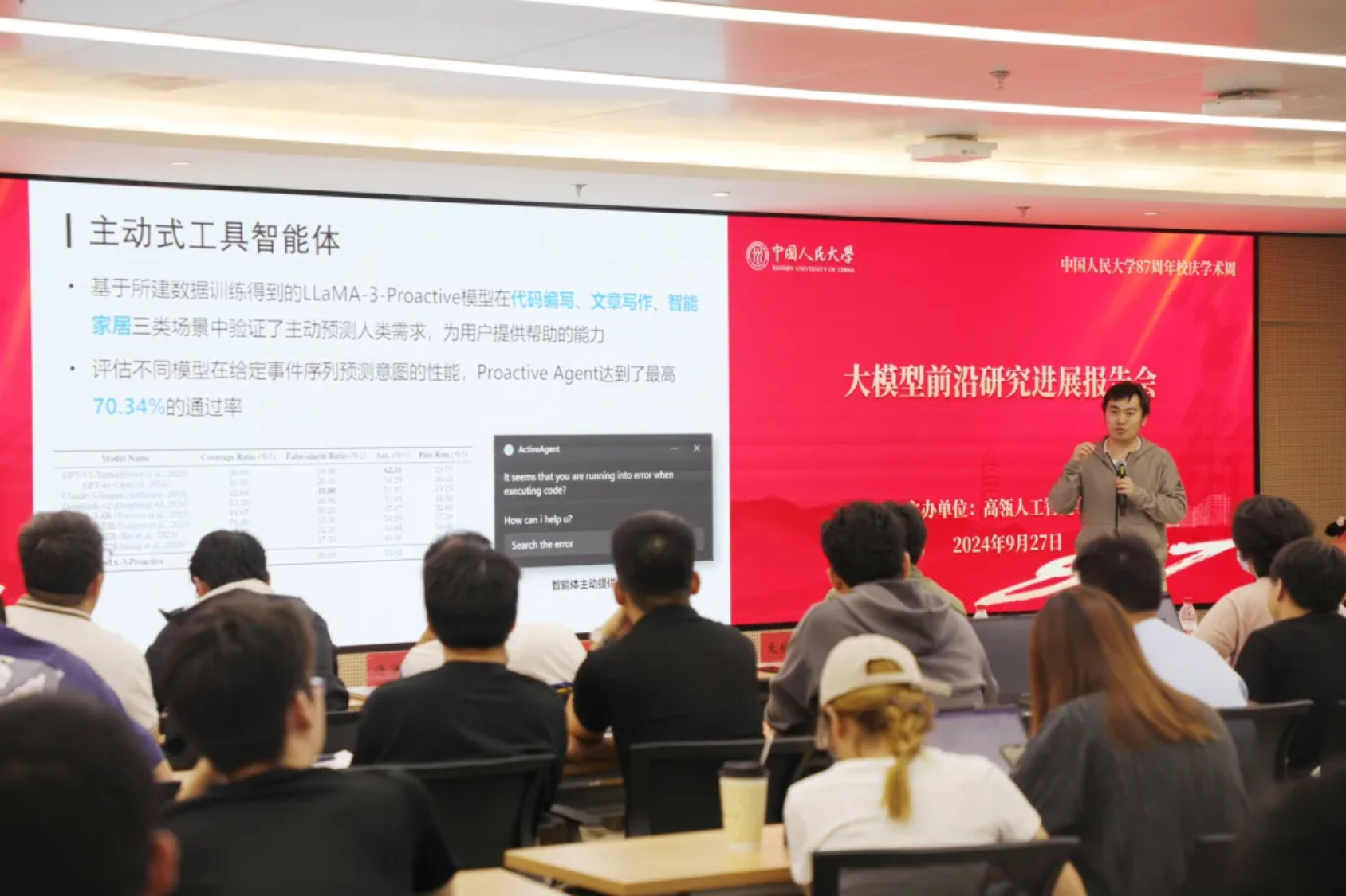 林衍凯准聘助理教授分享了题为“大模型自主智能体”的报告。他首先面向大模型智能体的工具使用问题,介绍了基于模仿学习和工具学习的两种典型工具学习方法。此外,他还介绍了大模型自主的后面安全性与工具对齐技术。最后,他从实际应用的角度探讨了大模型自主智能体的模糊意图理解技术、主动式智能体以及自动化流程技术等前沿性技术。