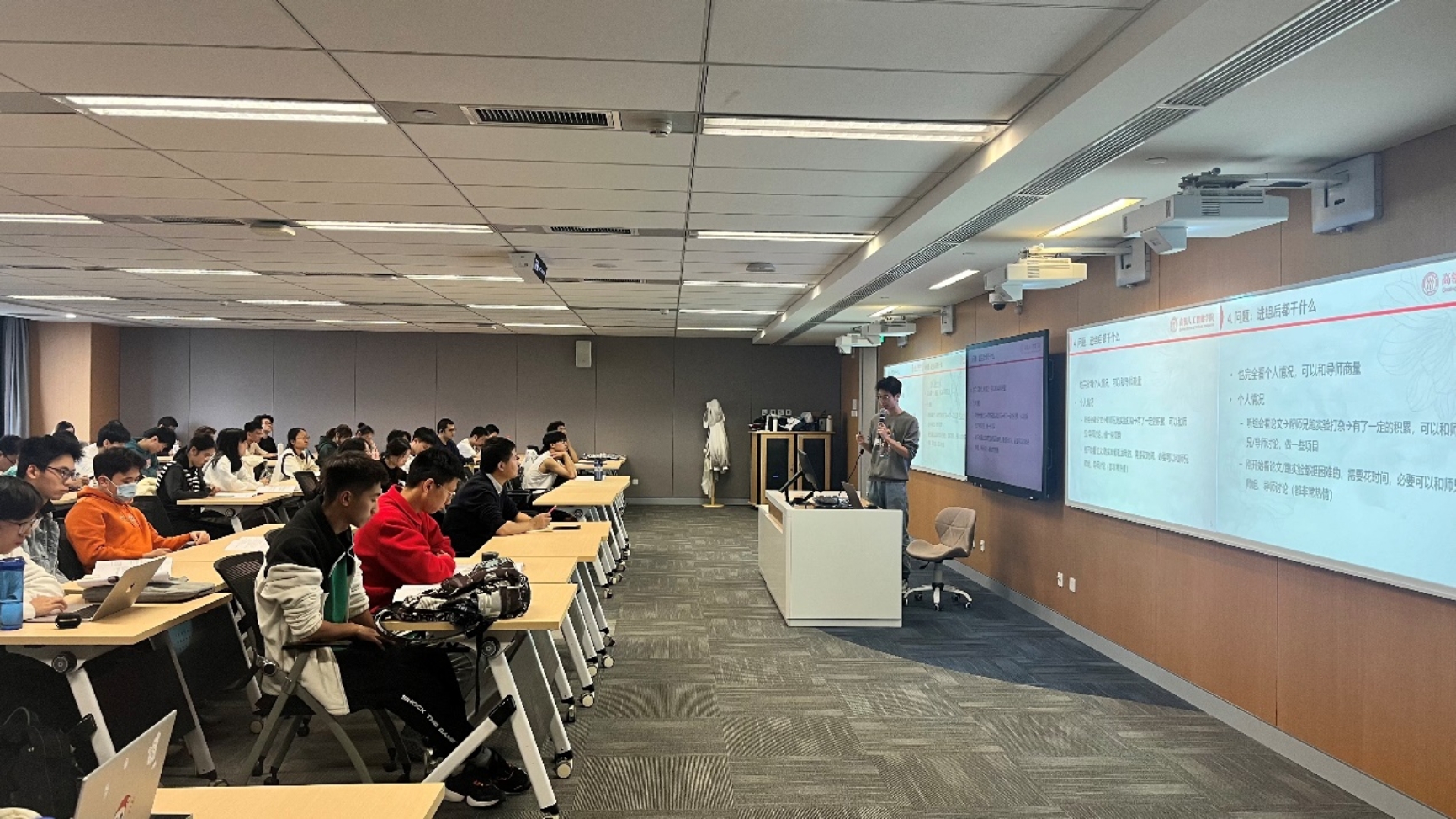 2021级本科生程翔同学介绍了自己在参与科研项目、发表论文方面的切身体验,并指出科研训练不仅有助于提升个人的学术素养,对未来求学及求职也大有裨益。同时,科研活动有助于同学们提前熟悉科研氛围,培养阅读和撰写论文的技能。此外,参与组会和学术报告,还能与师兄师姐及导师深入交流,获得宝贵的科研经验。他强调,科研项目最需要的是大胆尝试,同时需要时间和耐心。他鼓励同学们尽早适应科研氛围,培养文献阅读、论文撰写等基本技能,增强科研自信,并建议大家勇敢尝试,耐心投入。