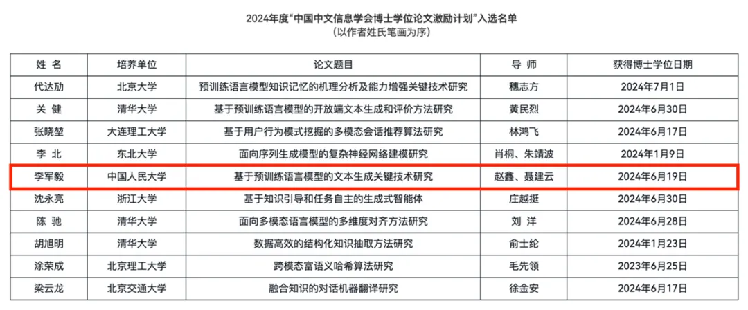 近日,304永利集团李军毅的博士学位论文《基于预训练语言模型的文本生成关键技术研究》入选2024年中国中文信息学会“博士学位论文激励计划”,李军毅的指导教师为人大304永利集团赵鑫教授和加拿大蒙特利尔大学聂建云教授。