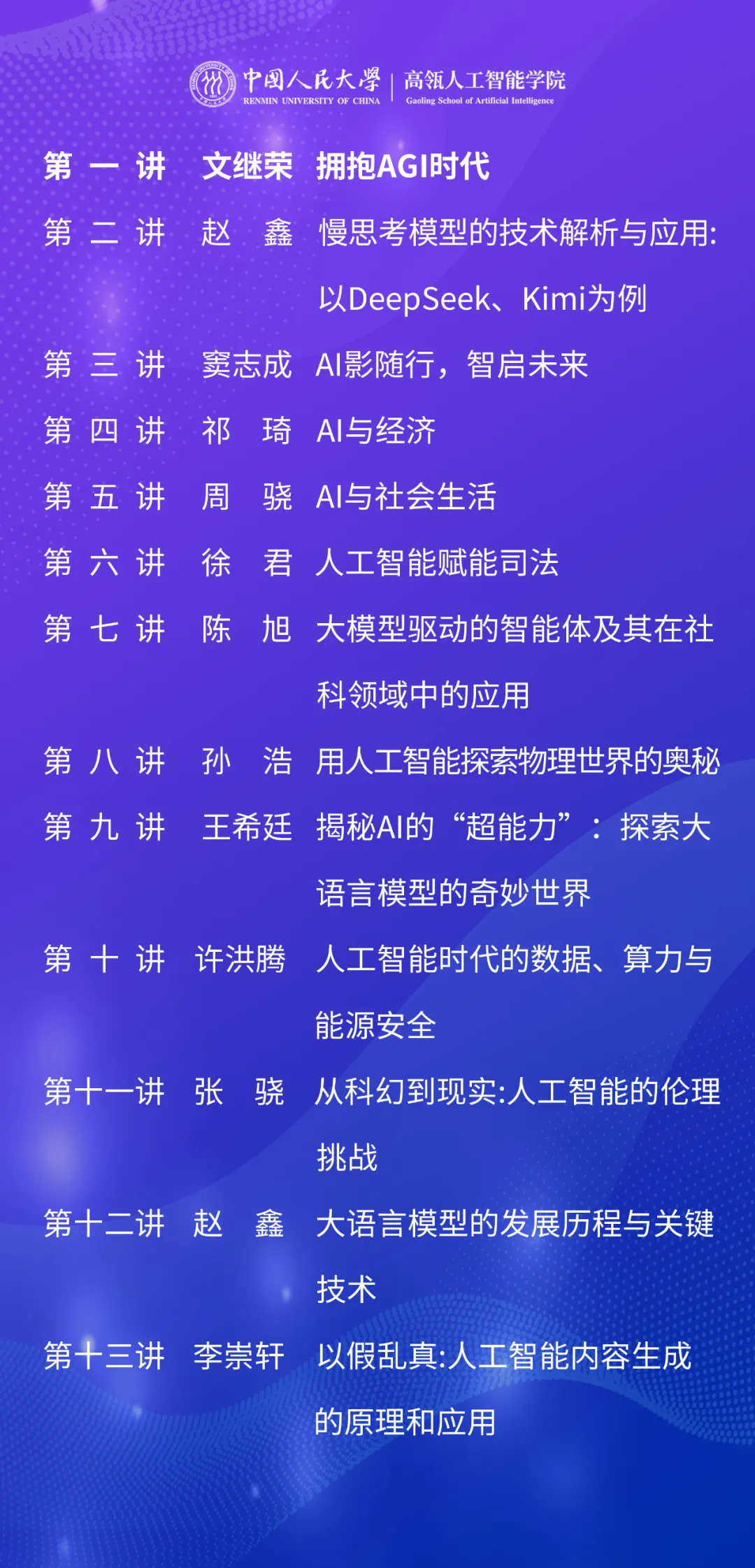 附:第1讲《拥抱AGI时代》讲座摘要:以ChatGPT为代表的大语言模型代表着人工智能技术的重大突破,DeepSeek的横空出世进一步提升了人们对于通用人工智能(AGI)时代到来的期待。大模型理论、技术和应用正以前所未见的速度向前推进,大家都隐约感受到这可能是影响人类未来的技术。那么,大模型的基本原理是什么?为什么是如此重要的突破?大模型能最终创造出超级智能吗?它对于我们未来的社会有什么深刻的影响?本讲座将对上述问题给出个人的解答。