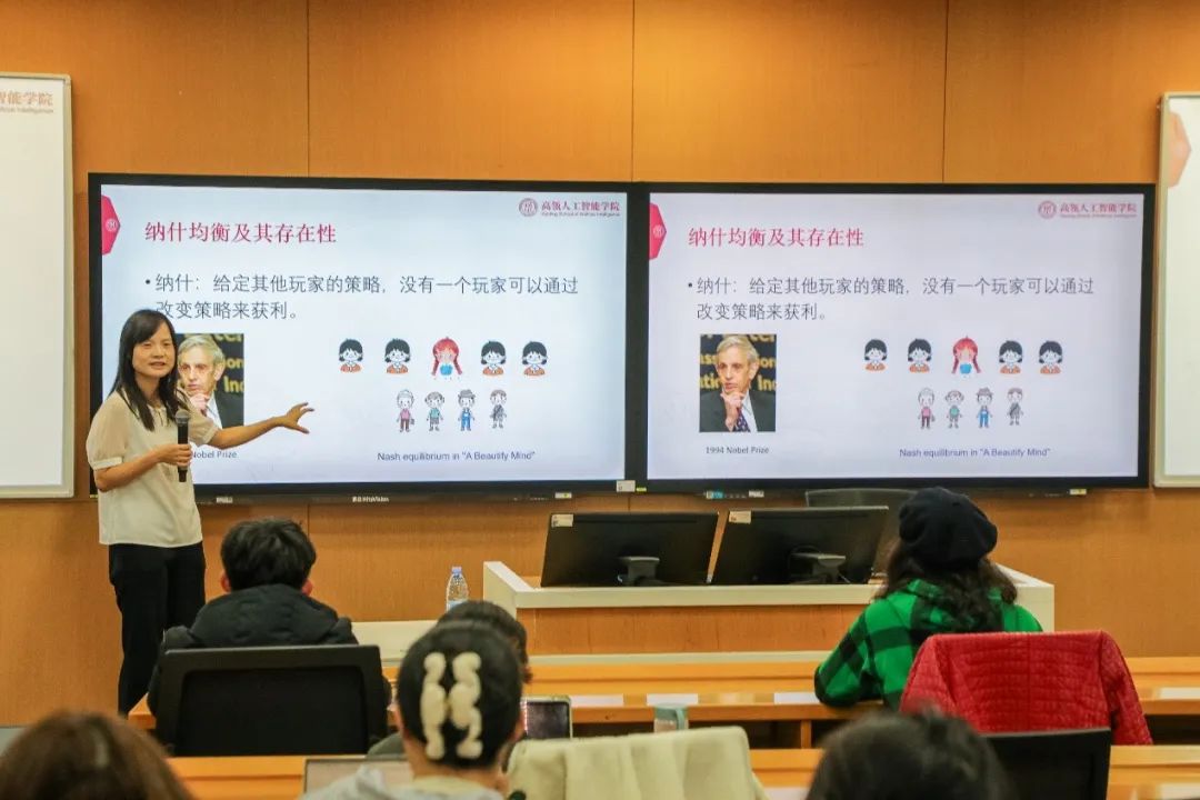 祁琦以其在人工智能+经济领域的深厚积累和独特见解,为在场师生带来了一场关于AI与经济学的精彩讲座。她从博弈论和机制设计的基础知识出发,通过纳什均衡这一经典概念,带领大家进入经济学的世界。祁老师详细讲解了纳什均衡的理论背景,并分析了机制设计与博弈论的关系。通过囚徒困境和拍卖理论等实际案例,她生动展示了博弈论和机制设计在现实中的应用,让原本抽象的理论变得易于理解。