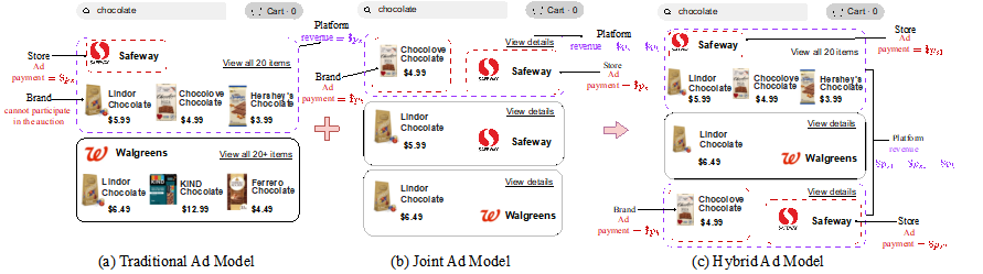 论文概述:在线广告是电商平台的主要收入来源。传统的商业模型是商店出价在广告拍卖中获取展现机会。近期我们团队与美团合作提出了联合拍卖这一新的广告商业模式并已上线使用。联合拍卖模式下一个广告位会展示一家商店和一个品牌的赞助bundle。与传统模式相比,它使平台能同时从品牌方和商店收取费用,从而提高收益。然而,在实际应用中,不同的广告模式可能会吸引不同的用户群体,适用于不同类型的商品和品牌,带来不同的点击量。联合拍卖是否一定比传统广告模式的收益更高?如果不是,有没有一种广告模式能带来更高收益?为了解决这两个问题,我们提出了一种名为“Hybrid广告”的全新模型,如图1所示。