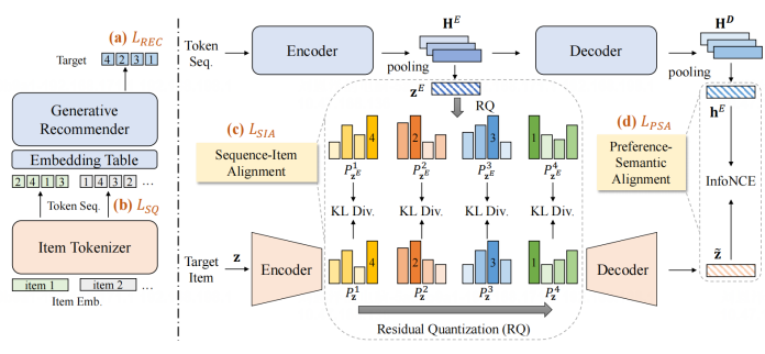 论文概述:生成式推荐作为一种直接生成物品标识符以完成推荐任务的新范式,逐渐成为推荐系统领域的研究热点。尽管具备潜力,这类系统面临的主要挑战在于如何构建与推荐系统良好适配的有效物品标识符。现有方法通常将物品分词(item tokenization)过程与生成式推荐训练割裂为独立阶段,导致物品分词与推荐任务存在偏差。为解决这一关键问题,我们提出ETEGRec,通过统一框架将物品分词与生成式推荐有机整合。该框架基于双编码器-解码器架构构建,包含物品分词器和生成式推荐器两个核心组件。为了实现这两个组件之间的知识融合,我们设计了一种面向推荐的对齐策略,其包含两个优化目标:序列-物品对齐与偏好-语义对齐。这些目标有效耦合了物品分词器和生成式推荐器的学习过程,促进二者的协同增强。此外,我们提出了交替优化技术以确保整个框架稳定高效的训练。在公开基准数据集上的实验结果证明了我们方法的有效性。