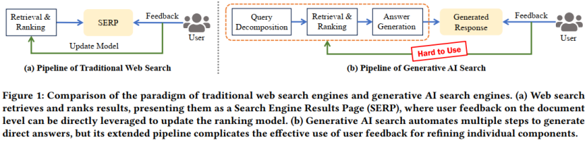 论文概述:以大语言模型(LLMs)为基础的生成式AI搜索正在重塑信息获取的方式,为用户提供了端到端的答案,极大地降低了用户手动浏览与总结多个网页的繁琐时间成本。然而,虽然这种新范式提升了便捷性,却也破坏了传统网页搜索中长期依赖的用户反馈循环机制。传统网页搜索通过用户的点击行为、停留时间等精细化反馈,不断地优化搜索排序模型;而生成式AI搜索的链路更加长而复杂,包括查询分解、文档检索和答案生成多个阶段,但其获得的用户反馈却通常非常粗粒度(仅针对最终答案),导致反馈难以映射回具体的中间阶段,阻碍了各个中间阶段的持续优化(比如难以利用反馈来更新检索模型)。