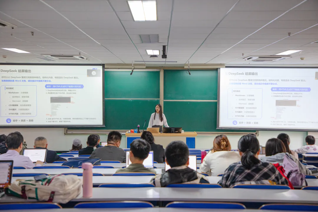 讲座开场,徐澜玲对活动背景进行了简要介绍。她提到,在大语言模型蓬勃发展的今天,DeepSeek这一国产开源大语言模型脱颖而出,为国内用户带来了更自主、更便捷的使用体验。徐澜玲详细讲解了DeepSeek的基本使用方法,同时也指出了DeepSeek存在的局限性,引导师生建立对大模型的全面认识。