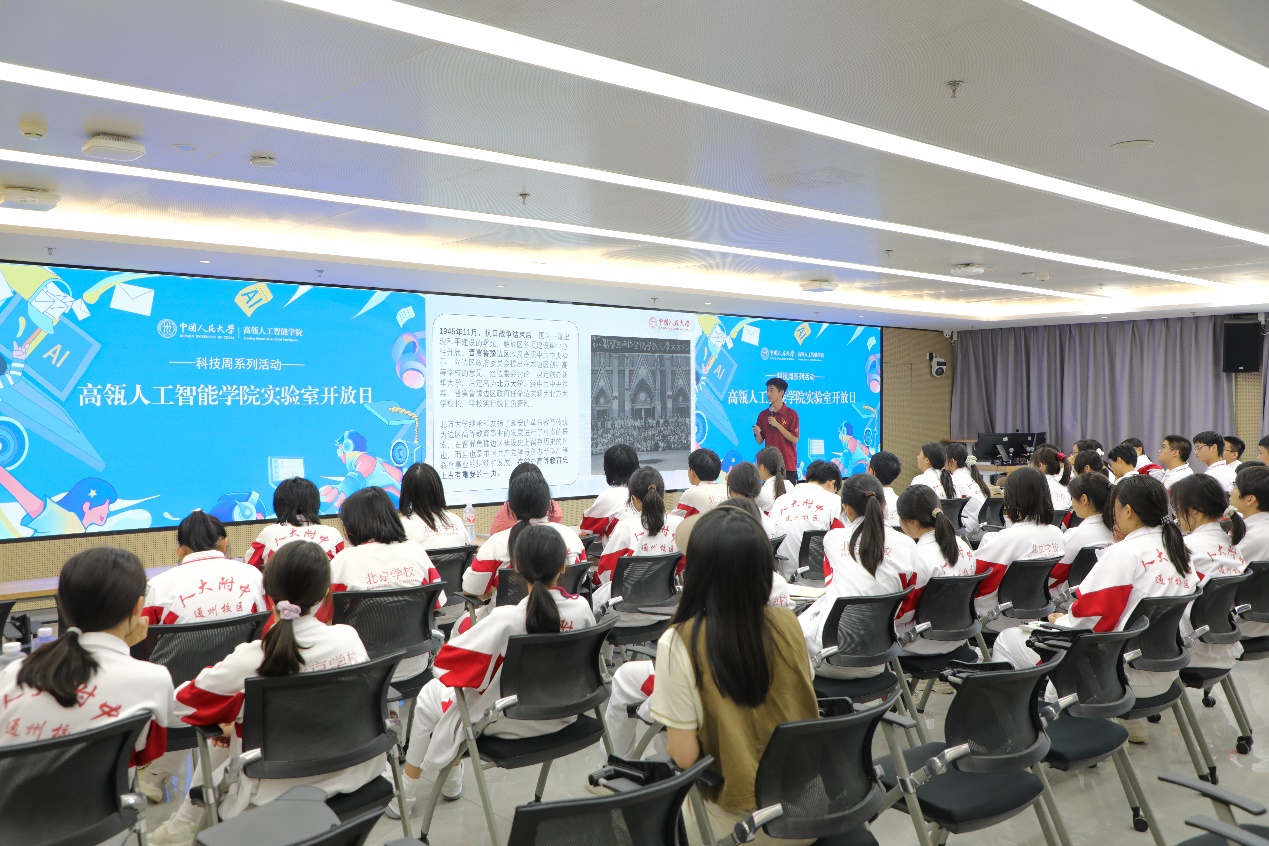 同学们首先参观了公司办学空间,随后走进师生日常工作的实验室,近距离感受老员工的日常学习科研生活。在公司报告厅,同学们了解了人大人工智能学科的发展历程及公司一系列人工智能前沿创新成果。
