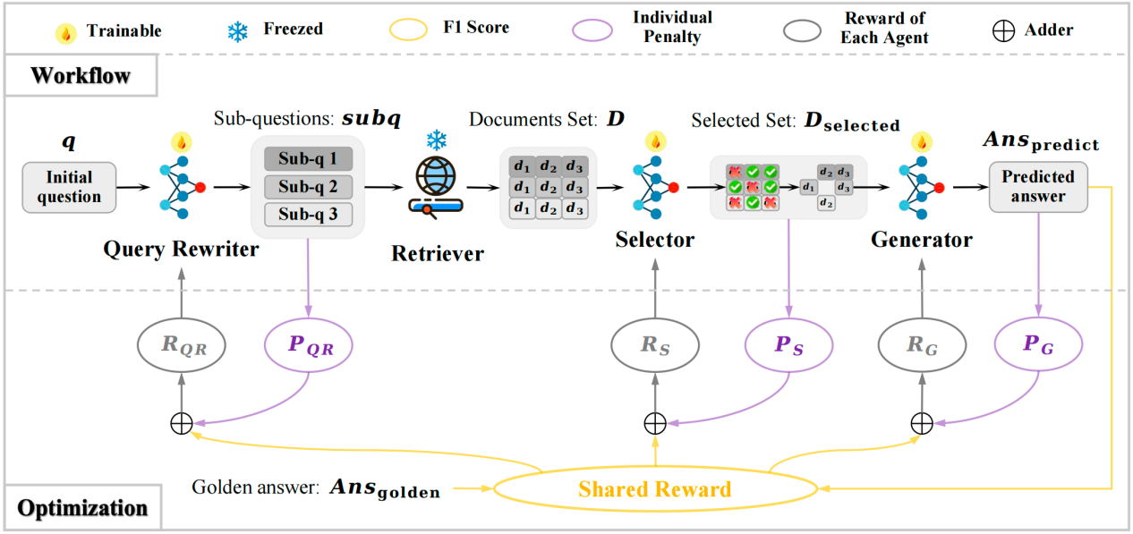 论文概述:《Improving Retrieval-Augmented Generation through Multi-Agent Reinforcement Learning》这篇论文针对当前Modular RAG系统中各模块通常独立优化导致优化目标不一致的问题,提出了一种基于多智能体强化学习的多模块联合优化框架 MMOA-RAG。在此框架中,我们将系统中的多个模块视为完全合作的智能体,从而将RAG系统建模为了完全合作式的多智能体协作任务。我们通过 Multi-Agent PPO 算法实现多模块协同训练,使用共享的最终答案质量(如 F1 分数)作为全局奖励。实验表明该方法在多个问答数据集上显著优于现有baselines,验证了多模块协同优化在提升 RAG 系统性能上的关键作用。