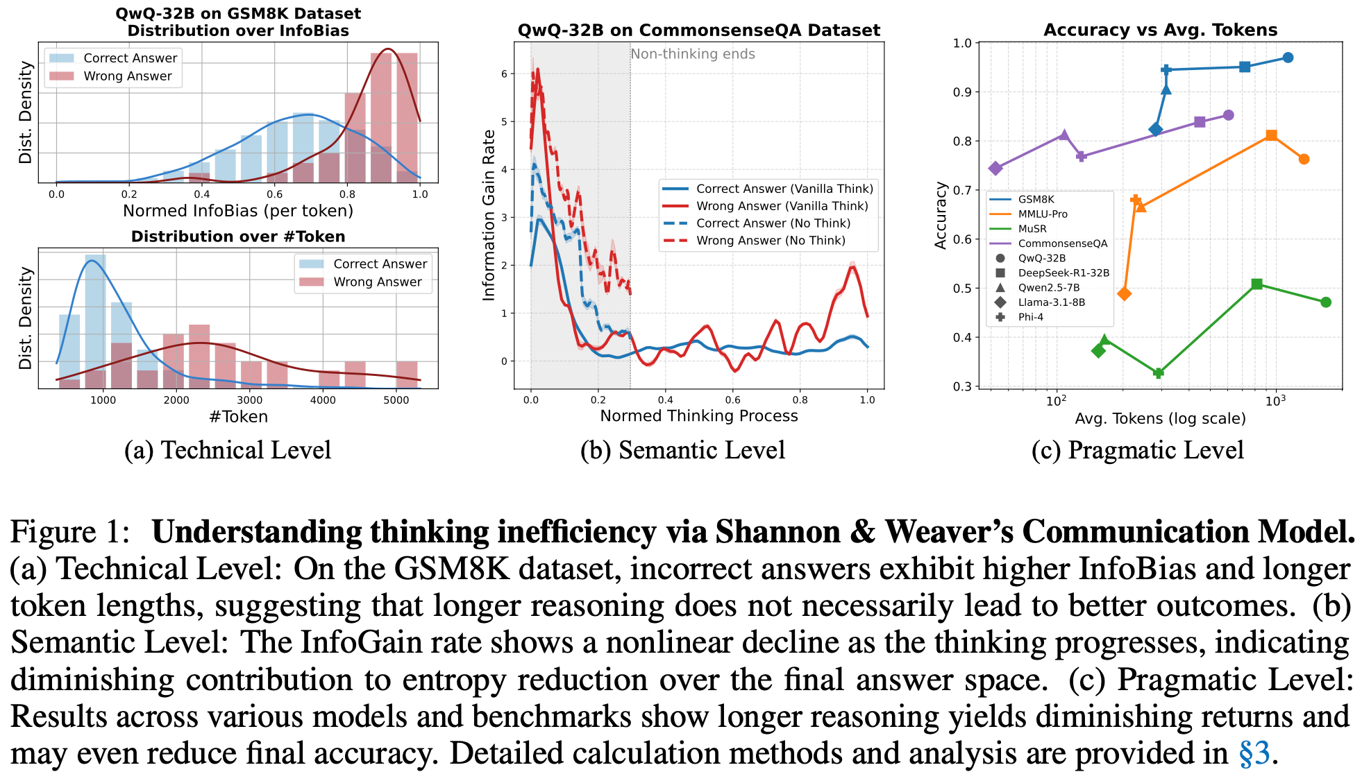 论文概述:大型推理模型(Large Reasoning Models)的兴起极大提升了多步推理能力,但也伴随着冗长推理链条的问题。本文从信息论视角重新审视推理效率,提出了两个核心度量指标——信息偏差(InfoBias)与信息增益(InfoGain),分别用于衡量推理路径的理想性偏离与逐步的信息贡献。实证分析发现,较长的推理链往往存在更高的信息偏差和递减的信息增益,尤其在错误答案中更为显著。基于这一观察,我们提出了一种基于熵的自适应推理策略(Adaptive Think),通过在模型置信度达到阈值时动态停止推理,以提升效率并保持准确性。实验结果表明,与默认的推理模式相比,该方法在QwQ-32B模型的六项不同类型与难度的推理任务中,实现了平均准确率提升1.10%,同时减少50.80%的token开销。这些结果展示了基于熵的方法在提升大模型推理效率与降低成本方面的潜力。