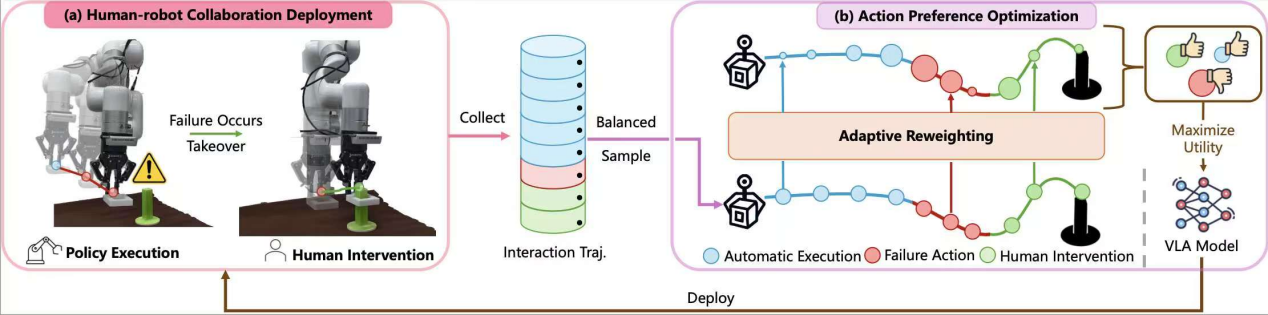 论文概述:尽管多模态大模型与大规模预训练数据显著提升了机器人的感知决策与泛化能力,但现有的VLA模型在执行下游精细操作任务时,成功率仍难以满足实际应用的需求。与其在预训练阶段继续提升模型的通用性,我们更关注于部署后的学习:我们旨在构建一个通用算法框架,使VLA模型能够在环境中进行可靠交互,并从交互数据中进行迭代式优化。基于此出发点,我们首次将人机协同与动作级别的偏好学习矫正结合,使得模型通过少量环境交互与人工矫错即可实现下游任务快速适配与动作矫正。