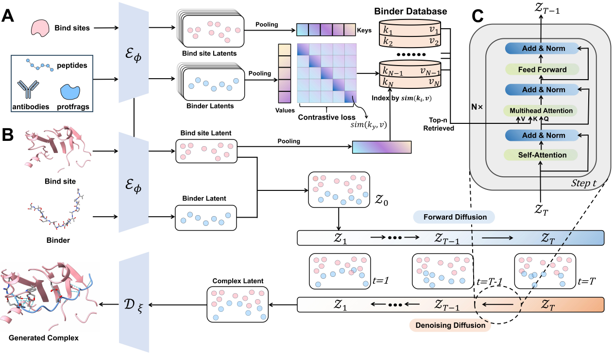 论文概述:在药物发现中,设计能够特异性结合靶点的蛋白结合物,并生成真实且功能合理的相互作用模式,是一项根本性挑战。现有的基于结构的生成模型在生成具备充分合理性与可解释性的结合界面方面仍存在局限。在本文中,我们提出了一种新的框架 RADiAnce (Retrieval-Augmented Diffusion for Aligned interface),该方法利用已知的界面来引导新型结合物的设计。通过在统一的对比潜在空间中结合检索与生成,我们的模型能够高效识别给定结合位点的相关界面,并将其无缝整合到条件潜在扩散生成器中,从而实现跨领域的界面迁移。大量实验表明,RADiAnce 在多项指标上显著优于基线模型,包括结合亲和力、几何结构及相互作用的恢复。进一步的实验结果验证了跨领域泛化能力,表明从多样化领域(如肽类、抗体和蛋白片段)中检索界面能够提升在其他领域结合物生成的性能。本研究建立了一种新的蛋白结合物设计范式,成功地将检索知识与生成式人工智能相结合,为药物发现开辟了新的可能性。