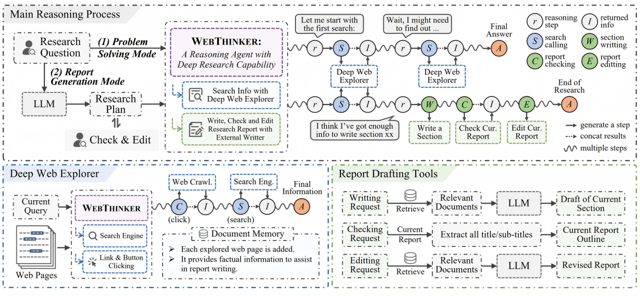 论文概述:大型推理模型(如OpenAI-o1和DeepSeek-R1)在长程推理任务中展现出卓越的能力,但其性能受限于对静态内部知识的依赖,尤其在处理复杂知识密集型任务或生成需综合多源网络信息的全面研究报告时表现不足。针对这一问题,本文提出WebThinker——一种具备深度研究能力的智能体系统,能够在推理过程中自主边思考、边搜索、边写作,来端到端完成一整个研究任务。该系统集成了“深度网络探索器”模块,使模型能够动态检索、遍历和提取网络信息以弥补知识缺失;同时采用“自主思考-搜索-起草”策略,实现推理、信息获取与报告撰写的无缝协同。为进一步优化研究工具的使用效果,我们还提出一种基于强化学习的训练策略,通过迭代式在线直接偏好优化(DPO)提升模型对工具的调用能力。在多个复杂推理基准(包括GPQA、GAIA、WebWalkerQA和HLE)以及科学报告生成任务(Glaive)上的实验表明,WebThinker显著优于现有方法及主流闭源系统,有效提升了推理模型在复杂场景下的可靠性,为构建更强大、更通用的深度研究系统奠定了基础。相关代码已开源:https://github.com/RUC-NLPIR/WebThinker。