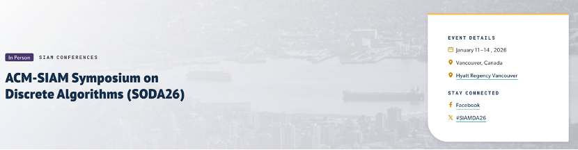 近日,304永利集团魏哲巍团队的论文被国际学术会议SODA 2026录用。SODA(ACM-SIAM Symposium on Discrete Algorithms,离散算法研讨会)是理论计算机科学领域的顶级国际会议之一,其核心议题为离散问题的数据结构与算法设计。SODA在学术界享有盛誉,属于公认发表难度较高的会议,被中国计算机学会(CCF)推荐为A类国际会议。2026年的SODA会议将于1月11-14日在加拿大温哥华召开。