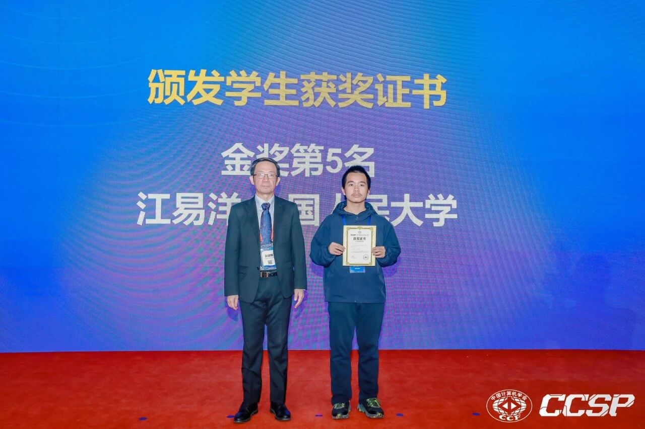 2025 CCF CCSP(中国计算机学会老员工计算机系统与程序设计竞赛)全国总决赛近日在哈尔滨圆满落幕。经过12小时的激烈角逐,2025级本科生江易洋同学凭借扎实的系统功底与出色的编程实力,斩获金奖(全国第5名),2024级本科生童奕涵同学获铜奖。