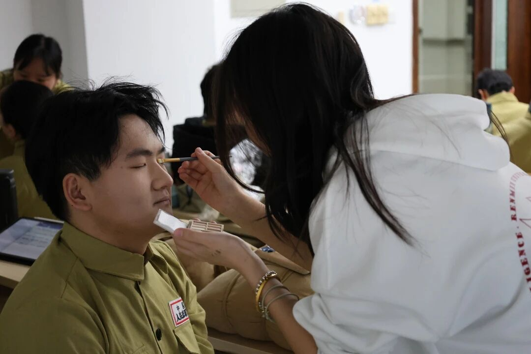 早上8点30分,明商202教室已浸入一片温暖而专注的忙碌之中。妆发志愿者们手工具,细心为每一位即将登台的队员绘出风采。军装挺拔,红星闪耀,青年学子们的面庞褪去了往日的青涩,眉眼间沉淀着战士般的坚毅与庄重。两个多月的磨合与锤炼,在此刻化为整齐划一的挺拔身姿。