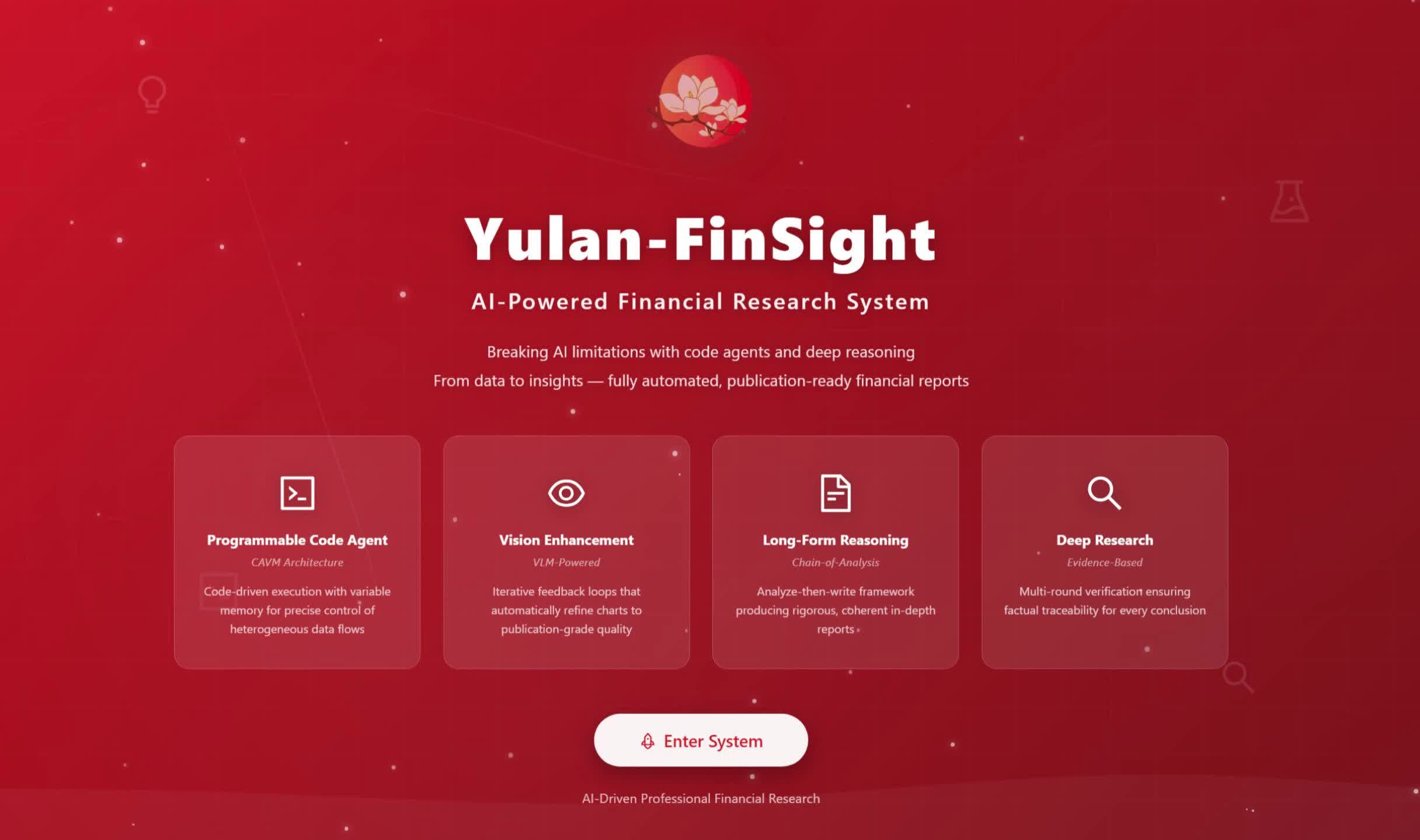 数以亿计的投资决策依赖于高质量、及时的研报。然而,撰写一份专业研报是极高强度的智力劳动,不仅需要处理海量实时异构数据,更依赖严谨的逻辑分析与专业的可视化呈现。目前的通用AI搜索系统(如 Perplexity, OpenAI Deep Research 等)在应对金融垂直领域时,常面临“领域知识缺失”、“图表生成简陋”以及“分析深度不足”三大挑战。为此,304永利集团官网推出了 玉兰·融观 (Yulan-FinSight) —— 一款面向真实场景的专家级多模态金融研报生成系统。
