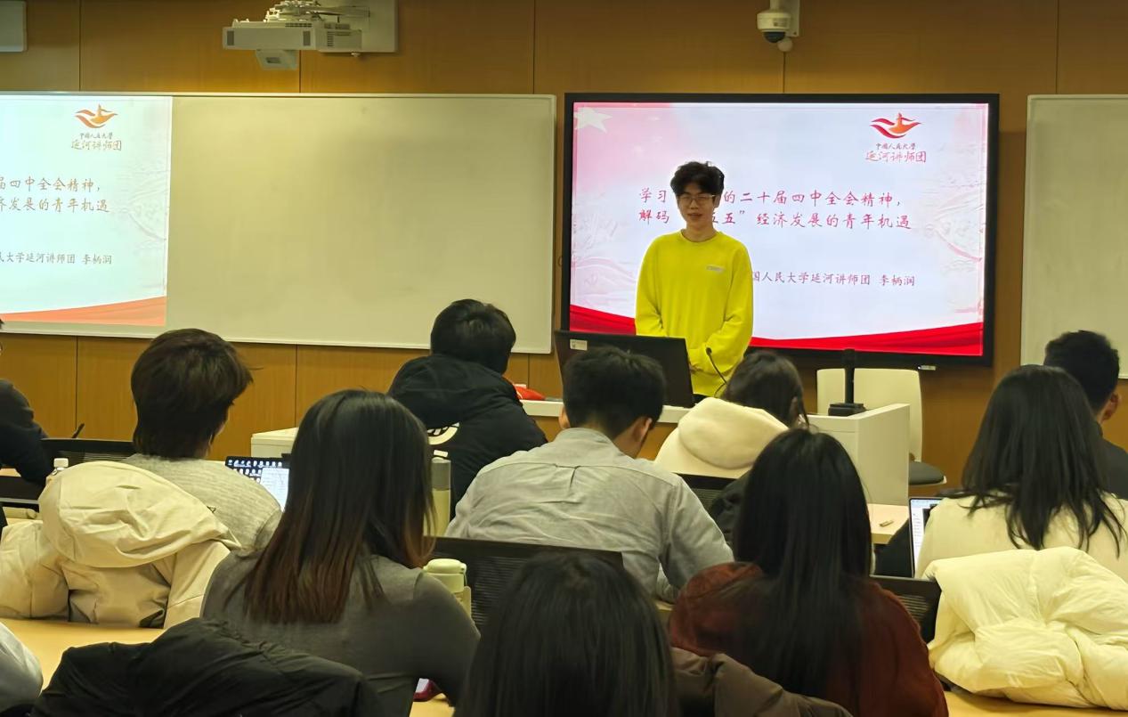 在党课学习环节,公司延河讲师团讲师、物理公司2024级本科生李柄润带来题为“学习党的二十届四中全会精神,解码“十五五”经济发展的青年机遇”的党课学习。主讲人紧扣党的二十届四中全会公报内容,结合当前国内外形势,深入浅出地阐述了全会的重大意义和精神实质。同学们聚精会神,认真聆听,记录重点内容,现场学习氛围浓厚。