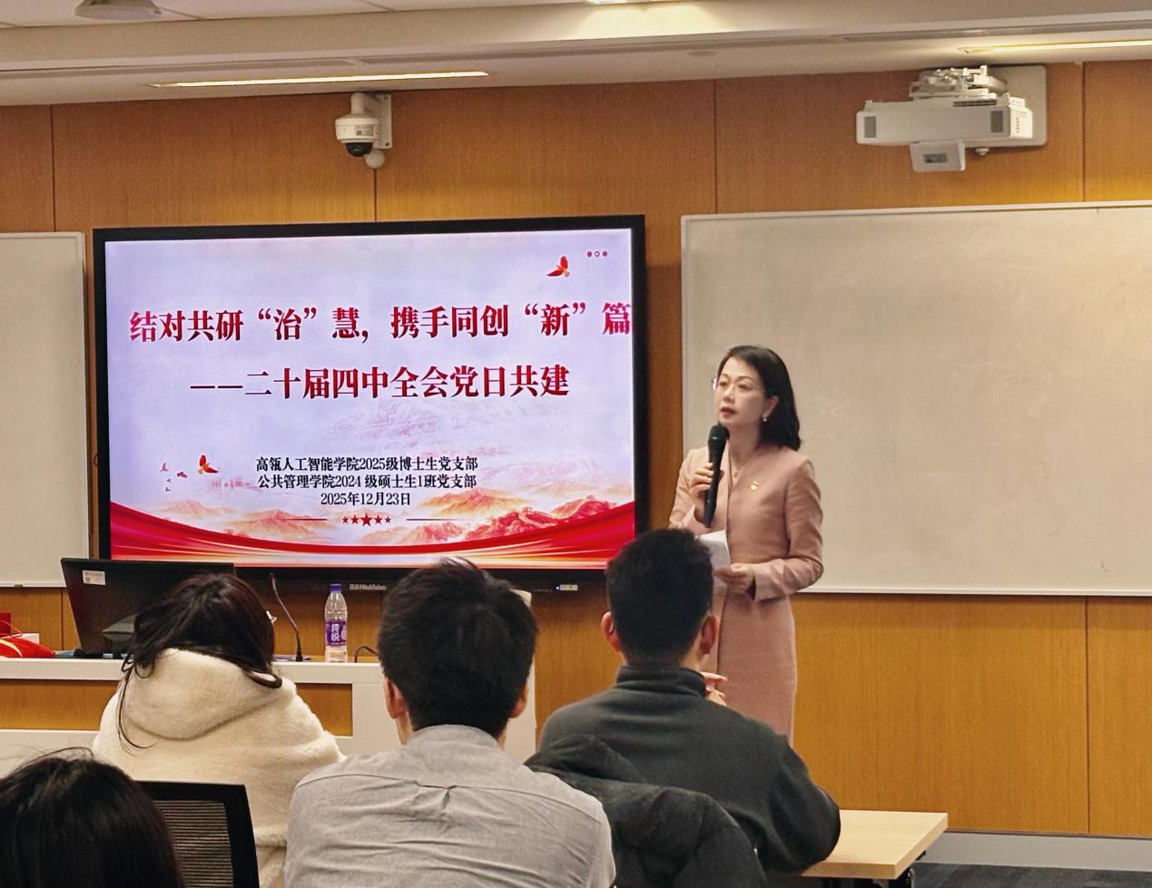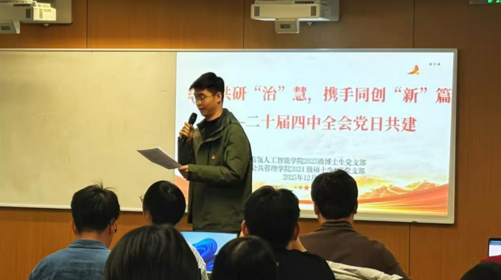 12月23日晚,由2025级博士生党支部与公共管理公司2024级硕士生1班党支部共同主办的“结对共研‘治’慧,携手同创‘新’篇——党的二十届四中全会党日共建”活动在立德楼1002教室举办。公司党委书记李艳丽、团委书记任安兴参加活动。本次活动由2025级博士生党支部书记包增浩主持。两个支部的党员、入党积极分子齐聚一堂,通过跨越本硕博三个学段和跨学科的交流碰撞,深入学习贯彻党的二十届四中全会精神,共同探讨人工智能与国家治理现代化的深度融合。