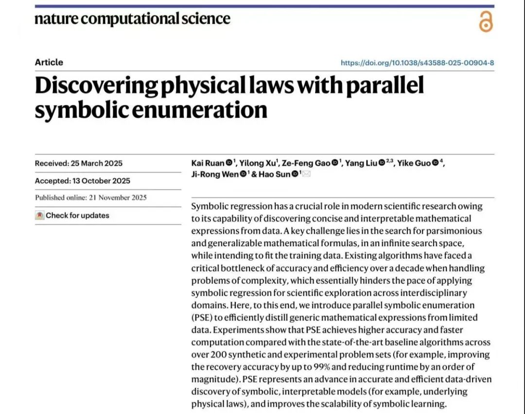 在 AI for Science 方向,联合发布图机器学习库Jittor-Geometric,依托国产深度学习框架Jittor,为图神经网络研究与应用提供高效、灵活的工程化支撑;同时在科学发现方法上推进“数据—符号—机理”融合,相关工作提出并行符号枚举(Parallel Symbolic Enumeration, PSE)并发表于Nature Computational Science,可从有限数据中更高效地蒸馏通用数学表达式,用于自动发现物理规律与可解释模型构建。