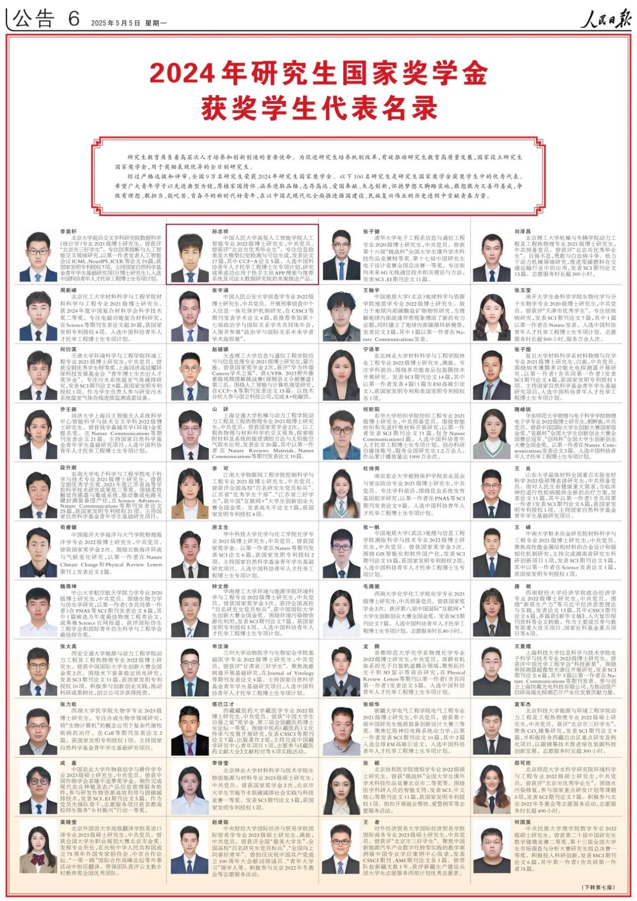 2025届本硕博毕业生实现高质量就业,硕博就业率均达100%。毕业生高一钊创立智子引擎公司,获304永利集团官网“吴玉章奖学金”;尹彦彬获“吴玉章奖学金”提名奖;周昆获“CCF优秀博士学位论文奖”;卫雅珂获“百度奖学金”;戴孙浩和聂燊入选字节跳动奖学金计划。孙忠祥作为国家奖学金获得者登上2025年5月5日出版的《人民日报》。
