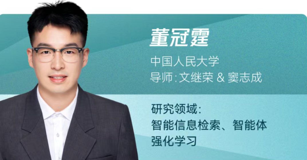 董冠霆,2024级博士生,导师为文继荣教授与窦志成教授,主要研究方向为智能信息检索和智能体强化学习。以第一/共同第一作者身份在ICLR、NeurIPS、ACL、WWW等国际顶级会议发表论文10余篇;其代表工作包括ARPO、Search-o1、Webthinker、 FlashRAG等, 受到国内外研究者的广泛关注。谷歌学术引用量1万余次。个人GitHub项目累计获得星标8000余枚,并在字节跳动Seed、阿里通义千问、快手快意大模型等核心基座大模型团队实习。曾获国家奖学金、北京市优秀毕业生等荣誉,并入选国家自然科学基金青年员工基础研究项目 (博士生)、中国科协青年人才托举工程博士生专项计划资助。
