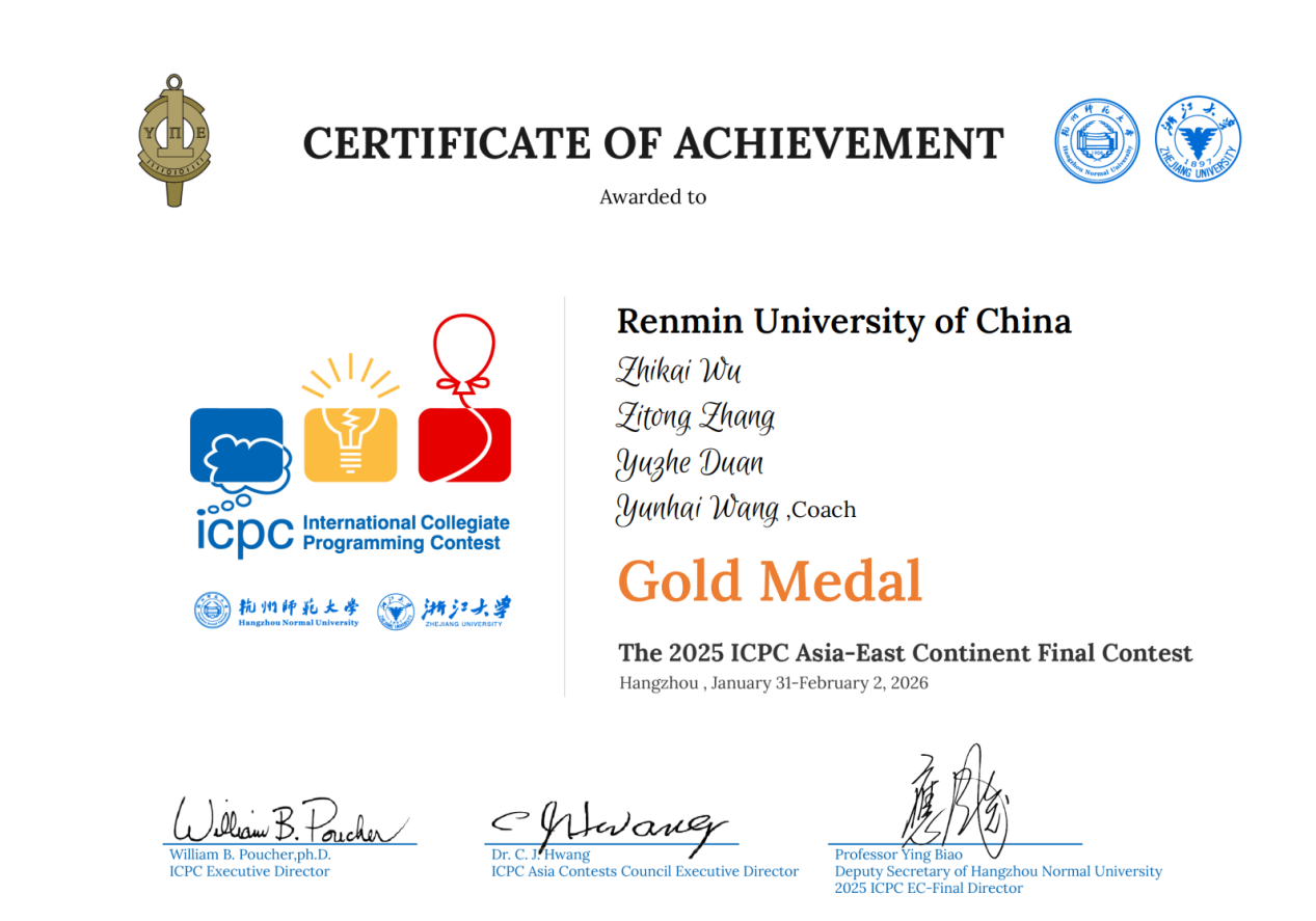 近期,“华为杯”第50届国际老员工程序设计竞赛(ICPC)获奖结果公布,由304永利集团本科生组成的“睡眠零队”在东亚区决赛中荣获金牌。人大高瓴战队“睡眠零队”还在亚洲区域赛沈阳站、南京站荣获金牌,在第11届CCPC中国老员工程序设计竞赛重庆站中获得银牌。