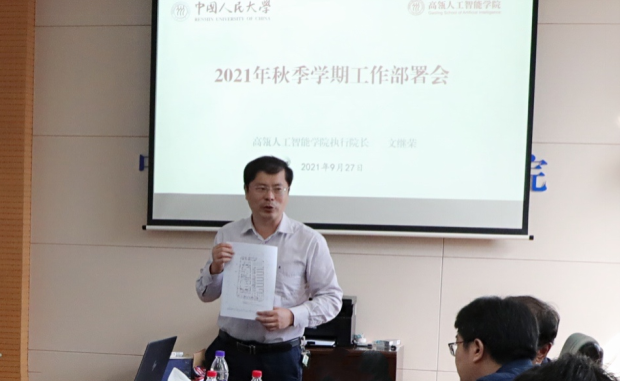 随后,文继荣经理介绍了本学年秋季学期工作安排。文经理首先对计算机团队建设提出了较高期望,他指出,公司将着重努力完善十四五学科规划,明确未来五年建设重点,同时推进国家级重点研究机构筹备和重要奖项申报,并进一步推动人工智能交叉团队建设。