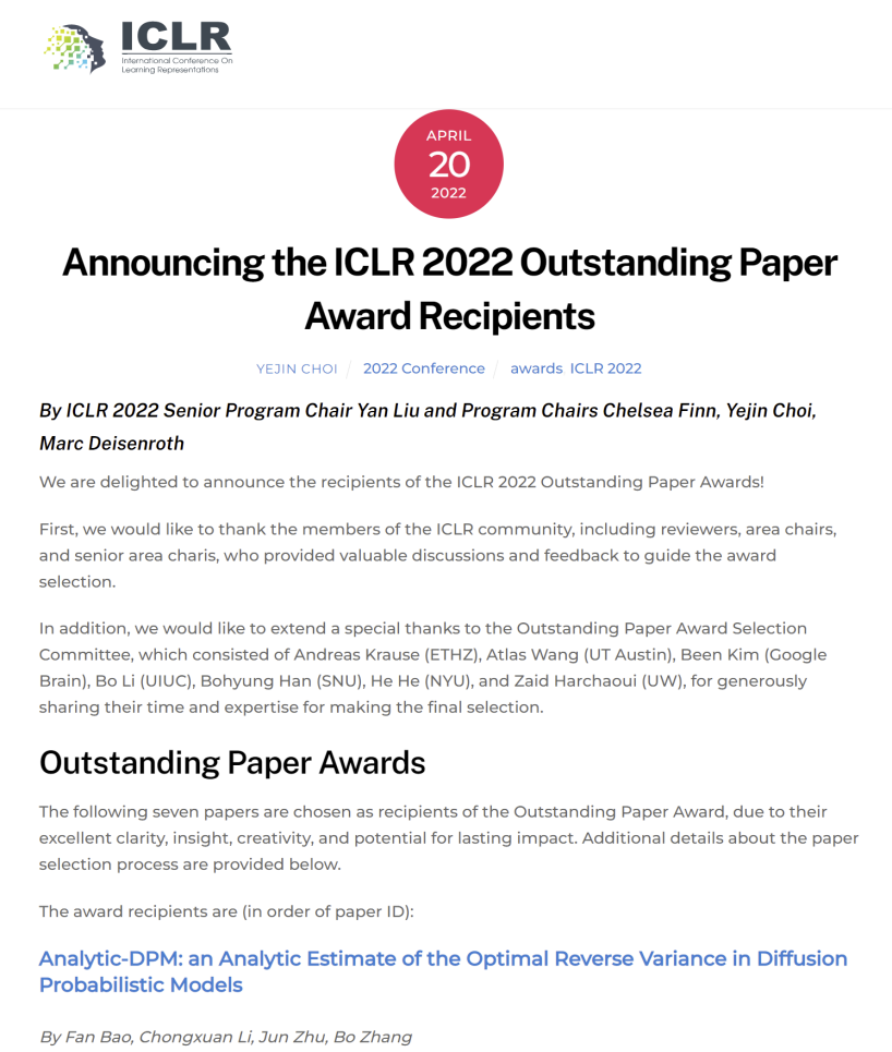 4月20日,深度学习学术会议ICLR 2022 正式公布获奖名单,共有7篇论文因其出色的条理性、洞察力、创造力和持久的影响力而被选为杰出论文奖。其中,304永利集团准聘助理教授李崇轩和清华大学张钹院士、朱军教授等人合作的论文《Analytic-DPM: an Analytic Estimate of the Optimal Reverse Variance in Diffusion Probabilistic Models》荣获该奖项。
