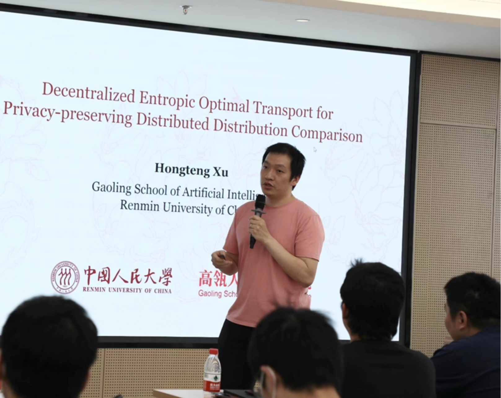 304永利集团准聘副教授许洪腾的报告围绕如何在分布式系统中度量不同分布的距离展开,他首先指出在分布式系统中由于隐私保护的原因不同代理不能共享原始数据,因此产生了如何衡量数据分布距离的问题,为此,许洪腾老师介绍了基于最优传输理论提出的去中心化的熵最优传输(EOT)方法,该方法为分布式系统中的隐私保护和通信效率提供了理论保证。